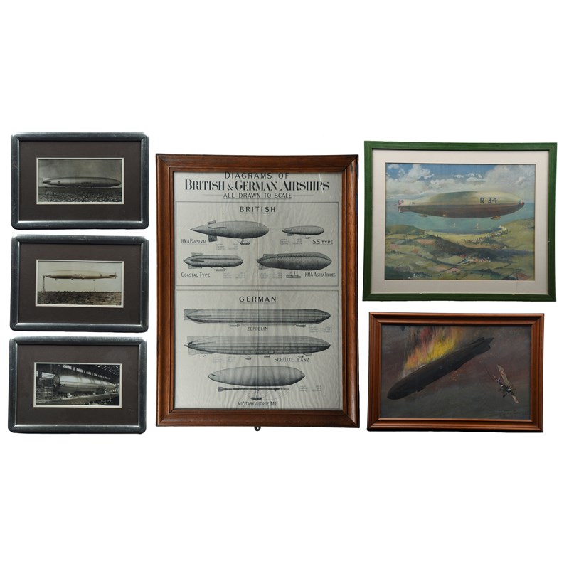 A quantity of airship themed art and display material in glazed frames, comprising: a watercolour drawing of Zeppelin LZ37 being shot down on the 6th June 1915, the Zeppelin (the first to be shot down by an aeroplane during the war) shown descending in flames to left and centre, to the right a Morane Parasol piloted by the victorious Sub-Lieutenant Reginald Warneford who was awarded the V.C. for this action, unsigned but with title, 29 x 46 cm; an identification poster: 'Diagrams of British and German Airships', 69 x 49 cm; three photographic prints of U.S. Navy airships; and a print of R34 flying over a coastline. [6]