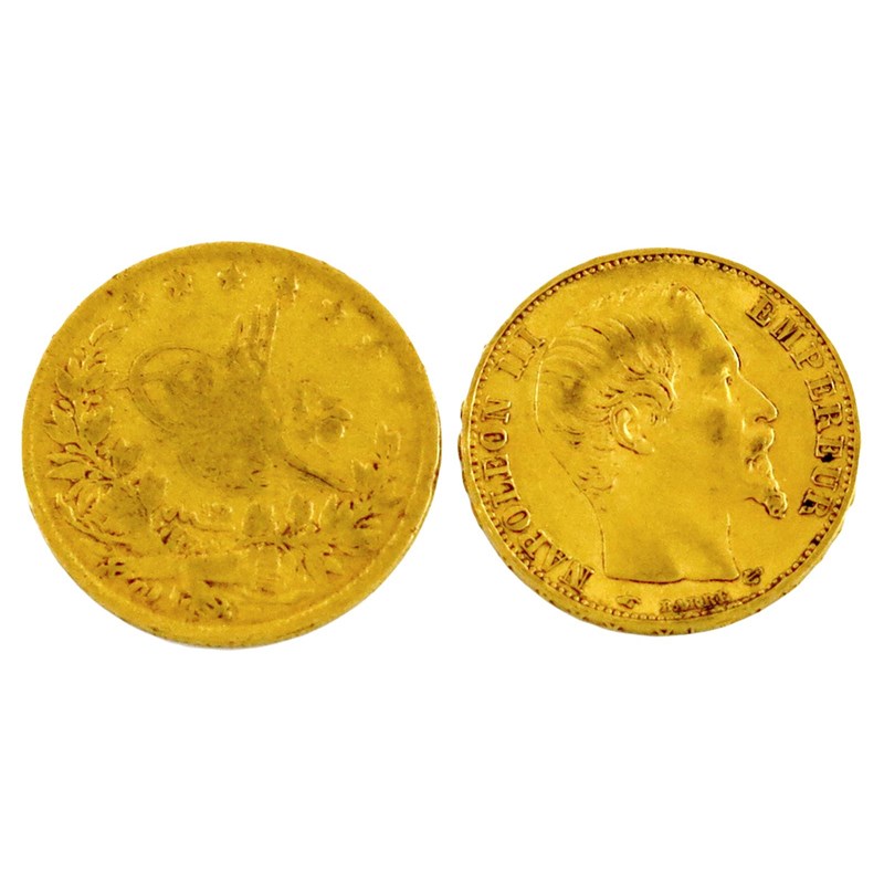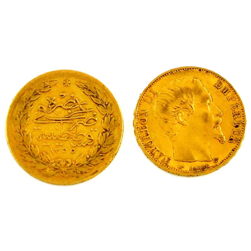 France, Napoleon III, gold 20-Francs, 1856 A; Turkey, Abdul Mejid (1839-1861), gold 100-Piastres, yr. 17. Very fine and fine.