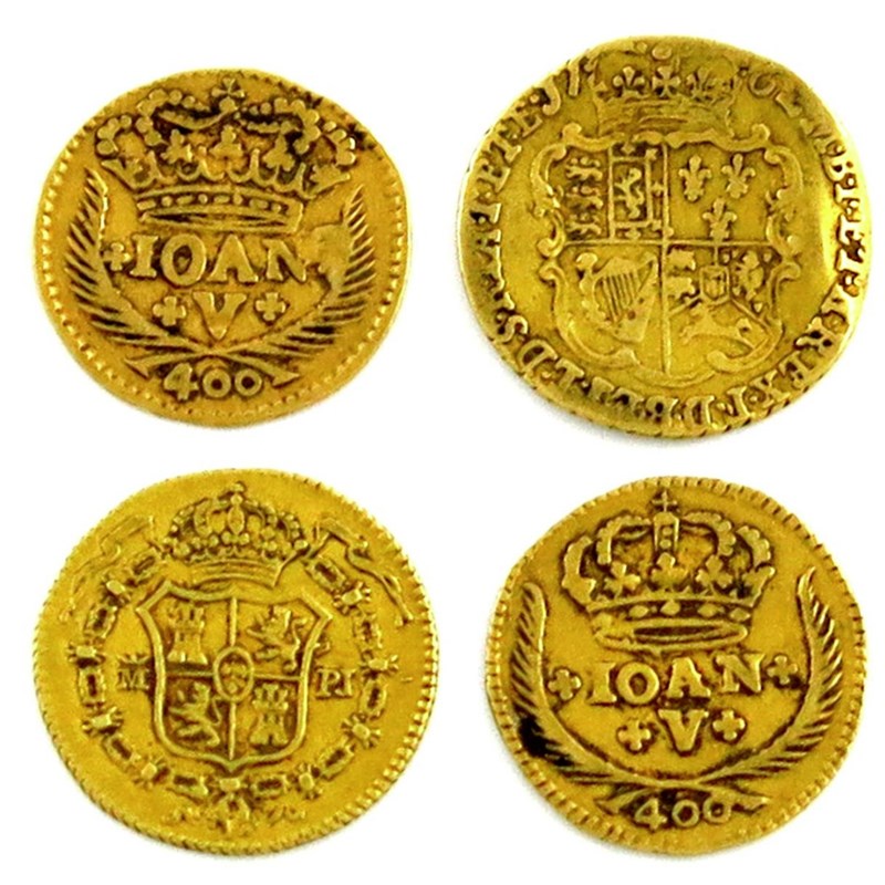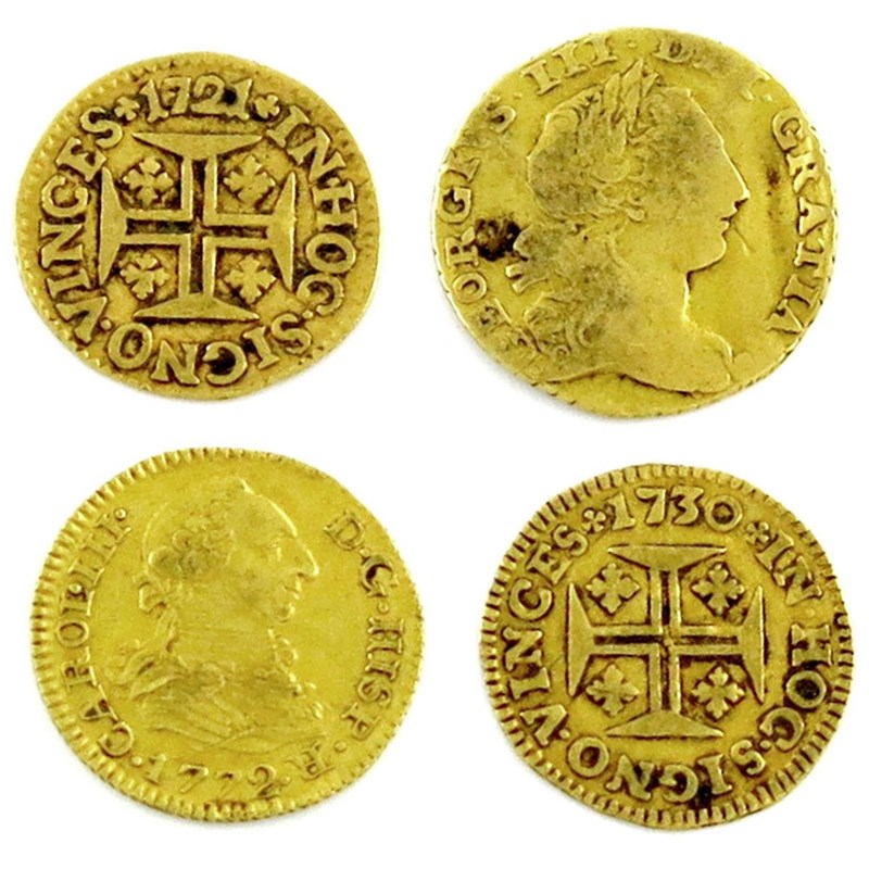 Portugal, John V (1706-1750), Cruzados (2) of 400-Reis, 1721, 1730; Spain, Charles III (1759-1788), Half-Escudo, 1772, Madrid, assayer PJ, these very fine; together with George III, Quarter- Guinea, 1762, bent and damaged. (4)