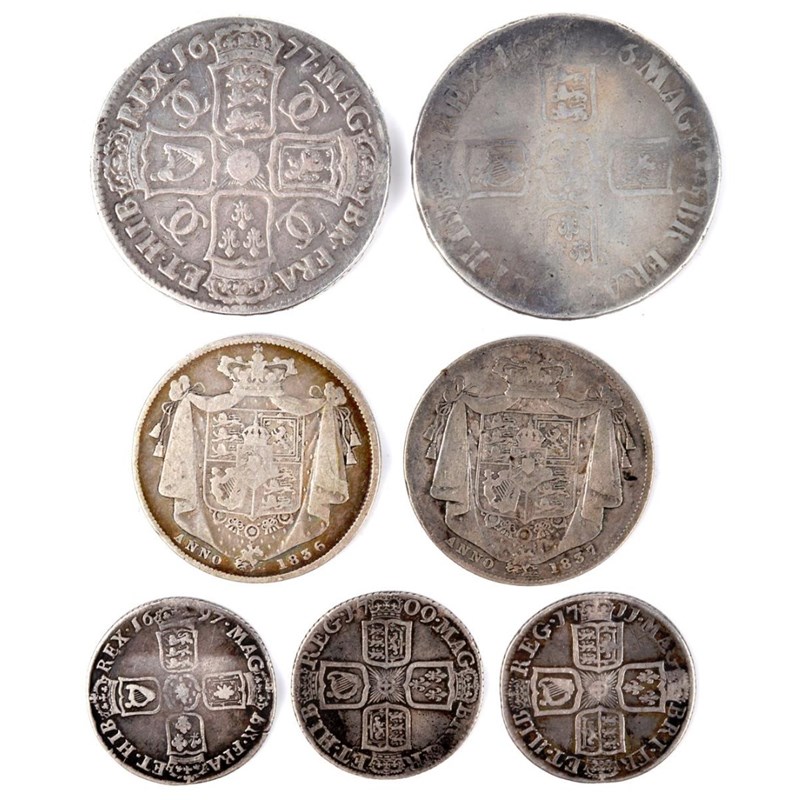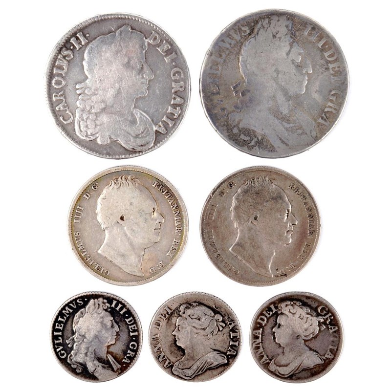 Silver Crown, Charles II, 1677, edge V NONO; Crown, William III, 1696, third bust, edge OCTAVO; Halfcrowns (2), William IV 1836, 1837; Shilling, William III, 1697; Shillings (2), Anne, 1709, 1711 (S 3358; 3472; 3834; 3505; 3610). Various grades from fair to fine. [7]