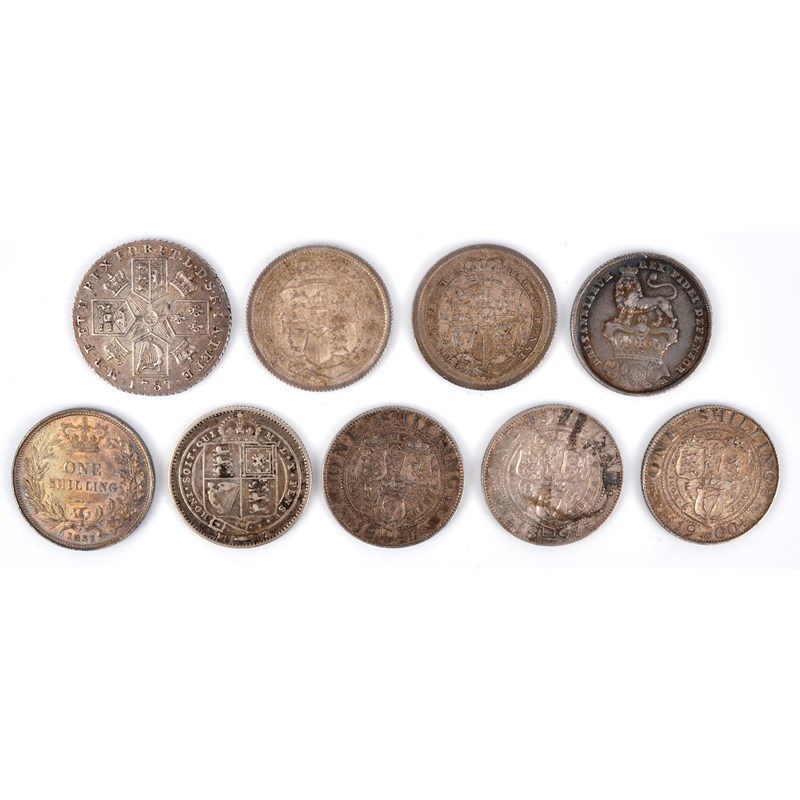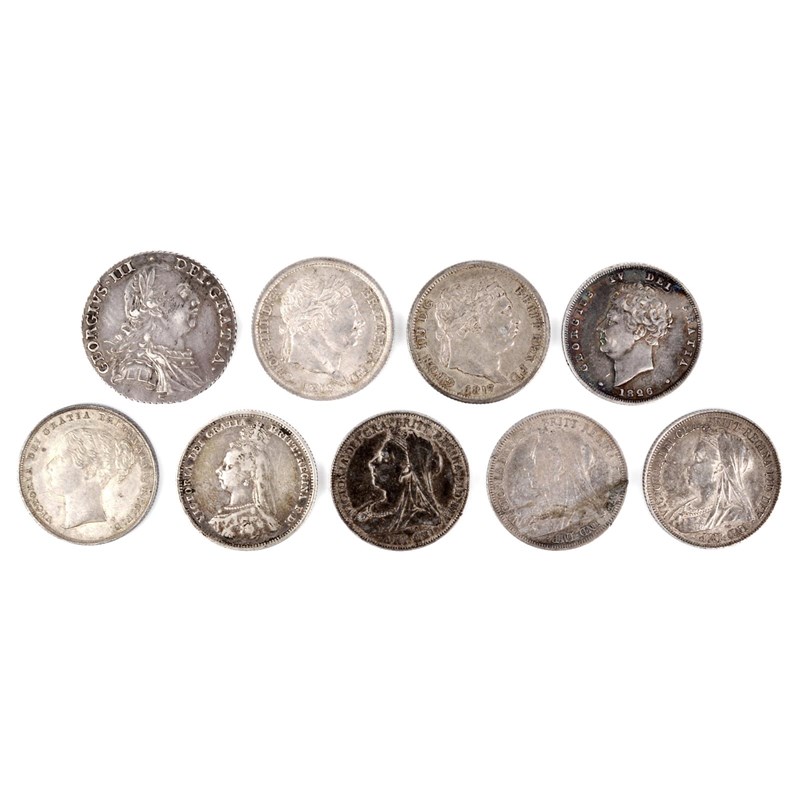 Silver Shillings (9), George III, 1787 with semée of hearts, 1817 (2); George IV, 1826 third reverse; Victoria, 1857 (near extremely fine), 1887 (fine), 1897 (2), 1900 (S 3746, 3790, 3812, 3904, 3926, 3940A). All about very fine unless otherwise stated