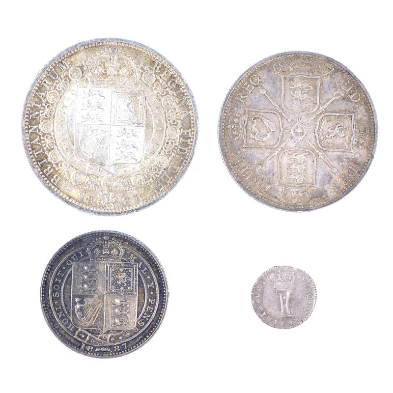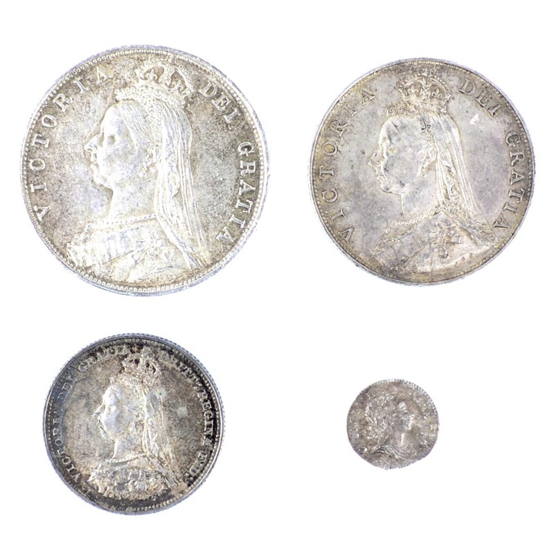 Silver Halfcrown, Victoria, 1887; Florin, 1887; Shilling, 1887, small head; Penny, George III, 1780, young bust (S 3924; 3925; 3926; 3759). Shilling very fine, others nearly extremely fine. [4]