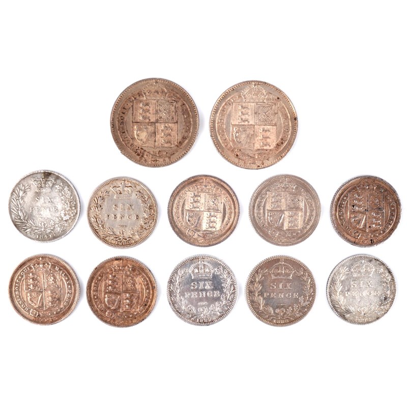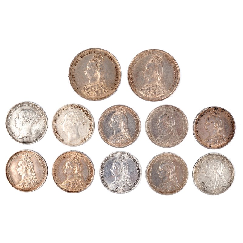 Victoria, Silver Shillings (2), 1887; Sixpences (3), 1841, 1883, 1887 (crowned mark of value); Sixpences (5), 1887, rev. shield in garter 'withdrawn' type; Sixpences (2), 1888, 1898. (S 3926; 3908, 3912, 3928; 3929, 3941). Various grades from very fine to extremely fine. [12]