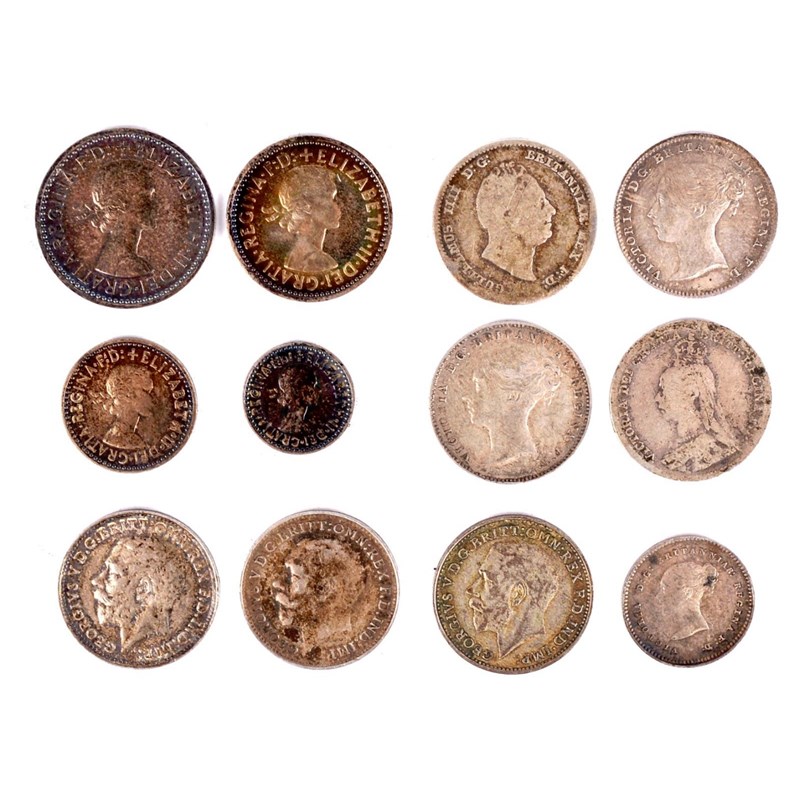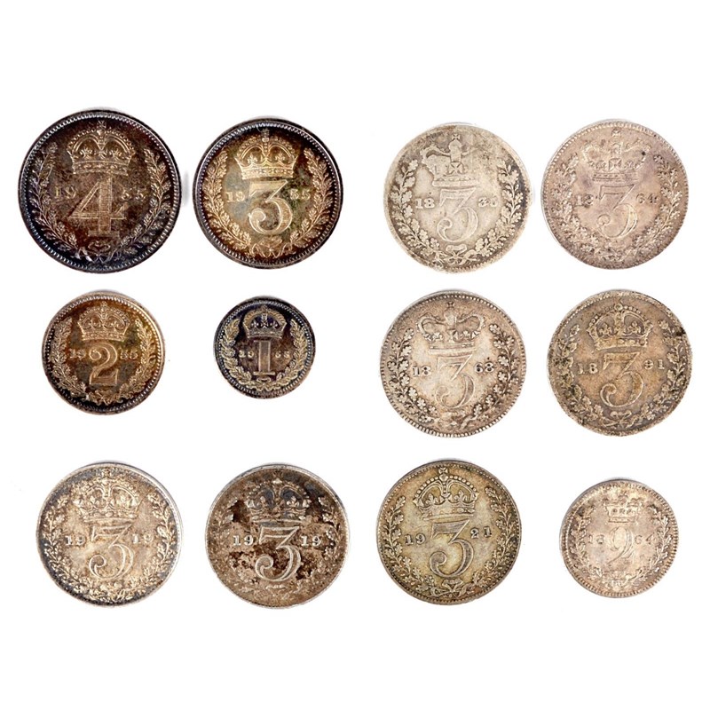 Maundy coins (12), set, Elizabeth II, 1955, uncased, attractively toned and good extremely fine; Threepences (7), George IV, 1835; Victoria, 1864 (very fine), 1868, 1891; George V, 1919 (2 one very fine), 1921; and Maundy Twopence, Victoria, 1864 (very fine). All only fair or fine unless otherwise stated.