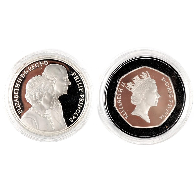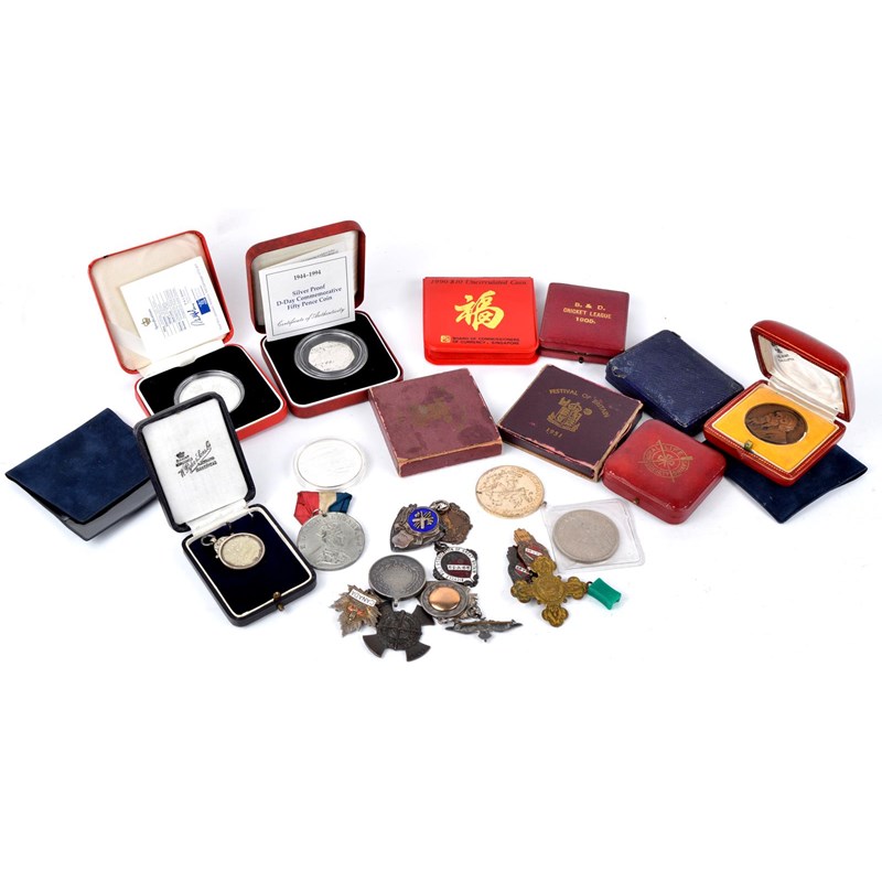Silver Five Pounds, Elizabeth II, 1997, Golden Jubilee commemorative proof, in case of issue, (S 4304); Silver Fifty Pence, Elizabeth II, 1994, D-Day silver commemorative proof, in case of issue (S 4353); together with a small quantity of commemorative coins and medallions, and sporting medals.
