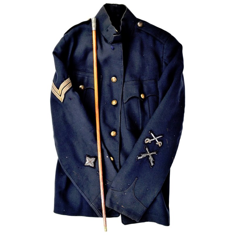 6th Dragoon Guards: a late 19th or early 20th Century uniform jacket, in blue serge with pleasted breast pockets, buttons embossed '6th DG OR RS CARAB', sleeves with corporal's chevrons and qualification badges (crossed swords and crossed rifles); together with a Griqualand West Brigade swagger stick. (2)