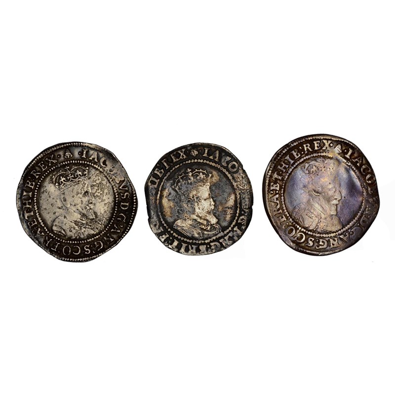 Ireland, James I, three silver shillings: first coinage (1603-04), first bust, mm. bell (S6512), very fine or nearly so; another of this type, near fine; second coinage (1604-07), forth bust, mm. rose (S 6516), near fine. [3]