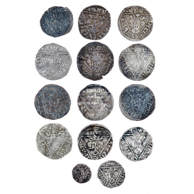 Ireland, Edward I, a collection of silver coins comprising: 2nd coinage (1279-1302), early issues: pennies (4), Dublin, pellet before EDW.R, one fine, the other good very fine or better; pennies (5), Waterford, one near fine, the others near very fine or better; halfpenny, Waterford, no pellet before EDW R, fine or better; farthing, Waterford, fine; 2nd Coinage, late issues: pennies (2), Dublin, both very fine or nearly so; penny, Dublin, pellet before EDW.R, good fine or better. [14]