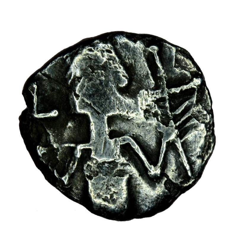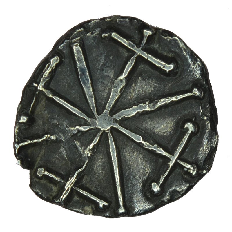 Anglo Saxon kingdoms: silver sceat, primary series W, c. 680-710, half length figure with two crosses, rev. cross crosslet on saltire, 1.4g. About very fine.