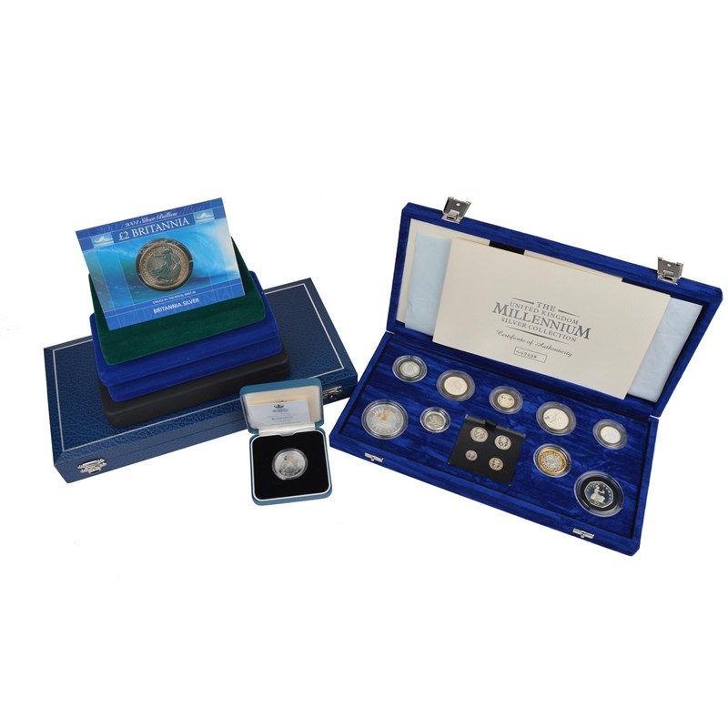 Elizabeth II, a collection of silver and Britannia silver proof coins, all cased with certificates and some in official sets, comprising: 2000, The Millenium Collection (13 coins), two pounds to one penny and maundy set (PSS 08); 2006, The Queen's 80th Birthday Collection (13 coins), two pounds to one penny and maundy set (PSS 22); 2000, Queen Mother Centenary piedfort crown (S 4553); 2003, piedfort one pound, DNA two pounds and Suffragette fifty pence, cased together (S 4590, 4577, 4614); 2005, two piedfort five pound coins, Horatio Nelson and Trafalgar (PSS 16); 2004, Britannia silver two pound, in card and plastic blister pack (S 4500); 1997, Barbados one dollar, Golden Wedding Anniversary; 2002, Channel Islands five pounds (3 coin set), Duke of Wellington; 2005, Channel Islands, five pounds (3 coin set with dress miniature medal), The Crimean War. Some mild patination and speckling in a few cases (notably PSS 22), otherwise about as struck.