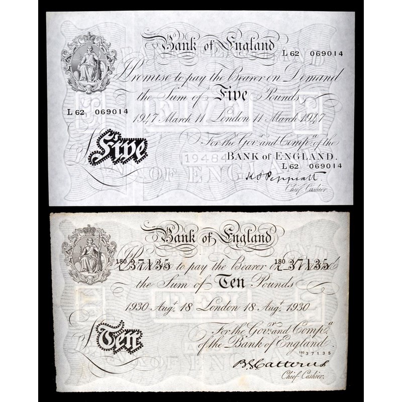 Great Britain: a collection of white five and ten pound notes: five pounds: Peppiatt, 14th March 1945; Peppiatt, 11th March 1947; Beace, 22nd July 1950, 7th April 1952; O'Brien, 6th February 1956, 10th September 1956; ten pounds: Catterus, 18th August 1930; Peppiatt, 19th November 1936; together with an Operation Bernhard forgery five pound note, 23rd November 1935. grades vary but mainly very high. [9]