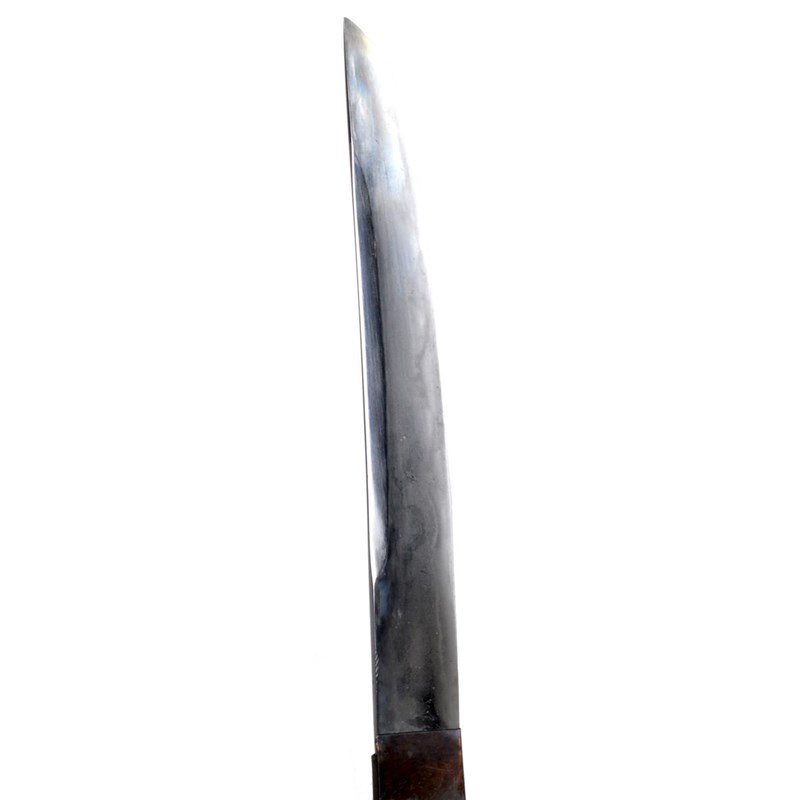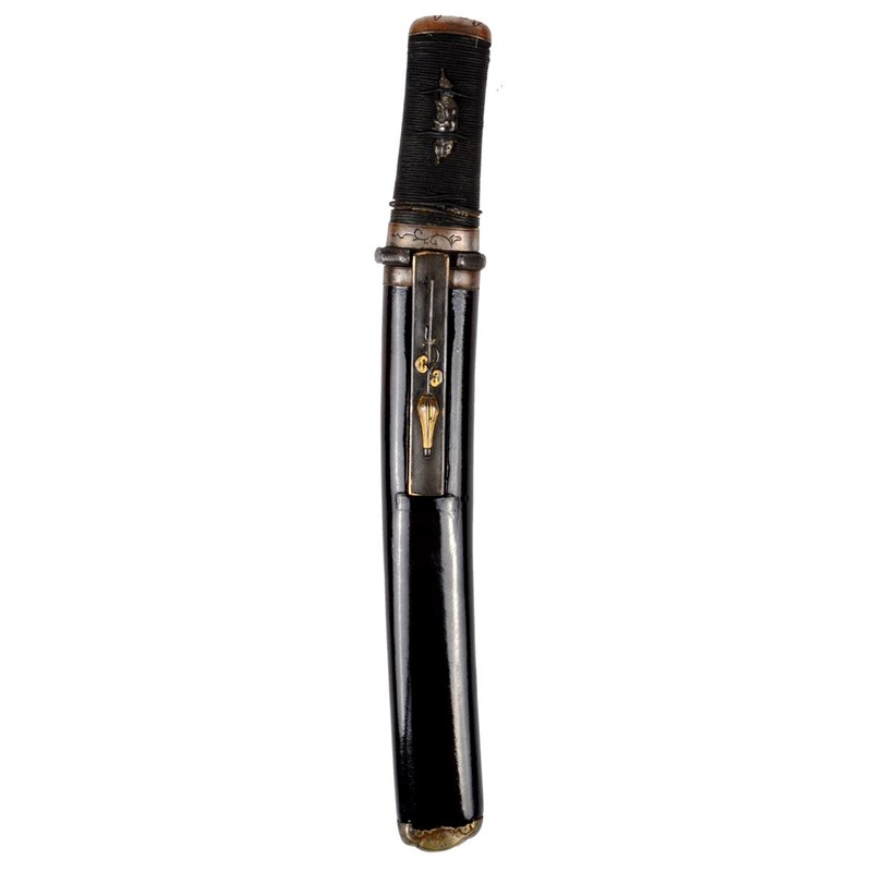 A Japanese dagger (tanto), blade 8.5 in., o-no-kubi-zukuri, copper habaki, cord wrapped grip with single menuki involving a horse, saya with associated kogatana.