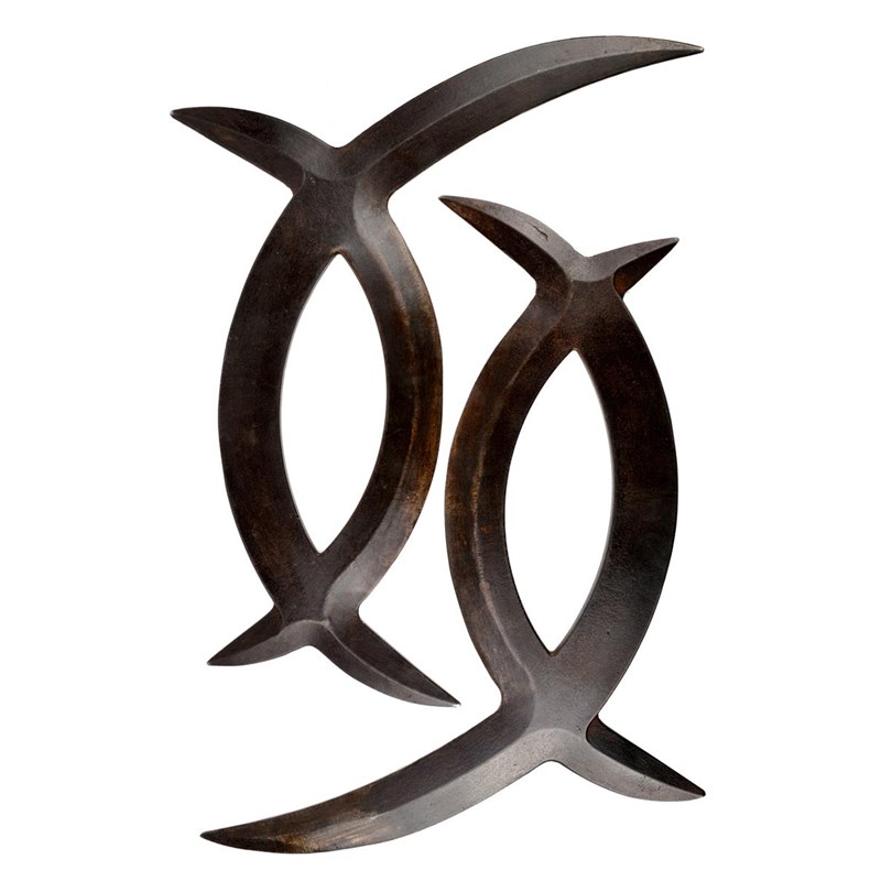 A pair of Chinese melee weapons, one piece iron or steel construction, each in the form of two opposed and overlapping crescents, the middle of one forming the grip and that of the other a sharpened knuckle bow, the ends forming four sharpened spikes, known by various names including 'Mandarin Duck Axes', 29.5cm (11.5 in.).