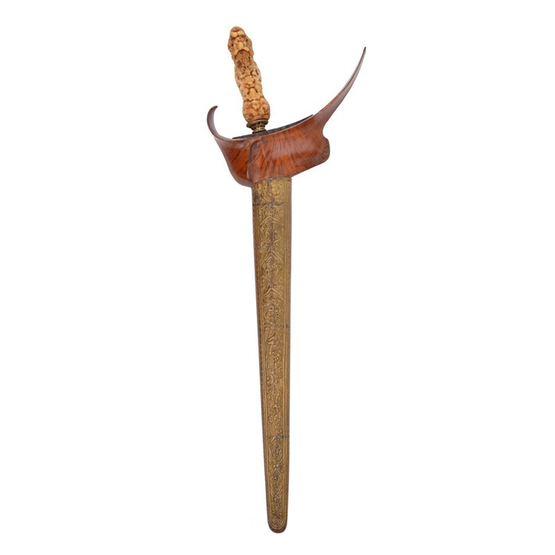λ An Indonesian dagger (kris), straight blade 14 in., ivory hilt profusely carved with botanical themes, scabbard with boat shaped wranka having carved details to a projecting lug, pendok with repousse decorated metal cover.