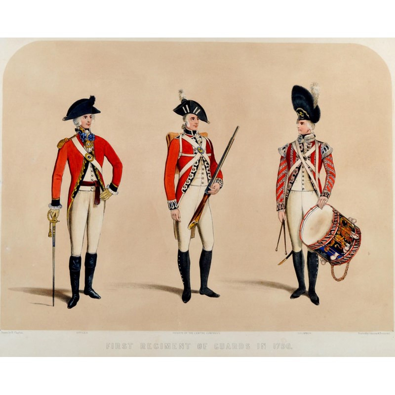Ten prints of military subjects, including: after B. Clayton, 'First Regiment of Guards in 1790', hand coloured engraving; 'Fifth Foot or Northumberland Fusiliers 1837', hand coloured engraving; 'St Pancras Volunteer/ Prime & Load', illustrating a stage in musket drill, aquatint; the Regimental Colours of the King's Own Royal Regiment, over-painted print, signed H.F. Burke (Sir Henry Farnham Burke, Garter King of Arms and Inspector of Regimental Colours), dated 22nd September 1924; two Baxter Prints: 'Review of the British Fleet at Portsmouth' and 'Charge of the British Troops on the road to Windlesham'; and four others. [10]
