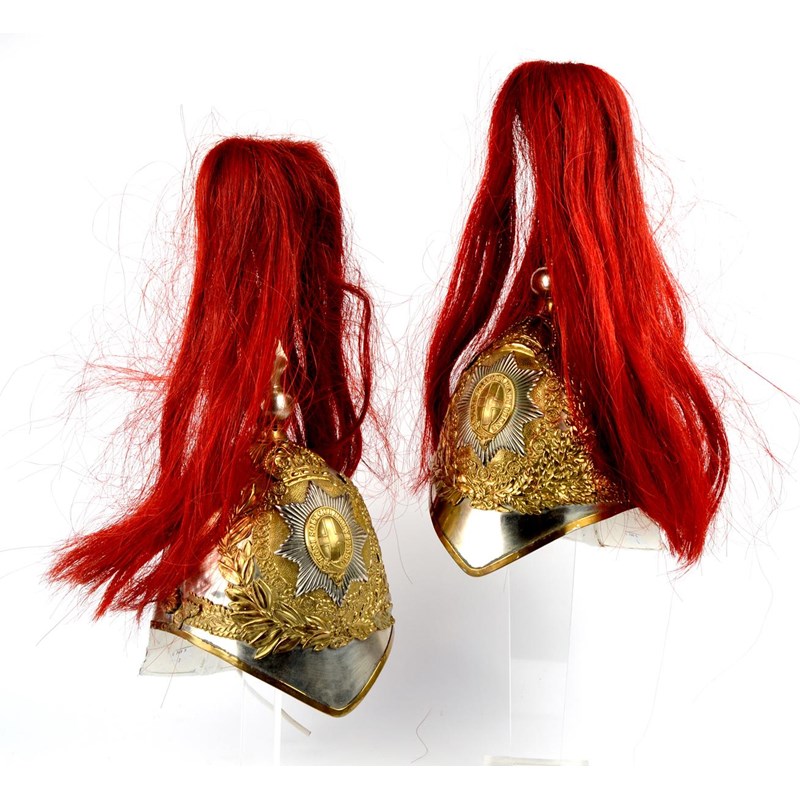 Two wall lights adapted from Blues and Royals other ranks parade helmets, each fitted with a bracket to the rear and a bulp holder, lacking chinstraps and rosettes. [2]