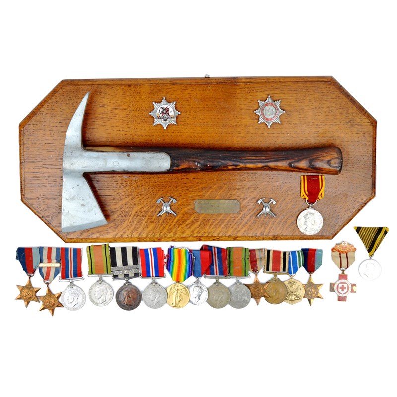 A collection of medals, including a 1914-15 Star Trio to the Army Veterinary Corps (SE 43229 A. CPL. D.J. HANNAN. A.V.C.); a Great War pair (71670 PTE. H. DICKINSON. NOTTS & DERBY R.); various Second World War campaign medals; other medals; and the Fire Brigade Long Service Medal to Leading Fireman William D.P. Davies, with an presentation mounted fire axe.