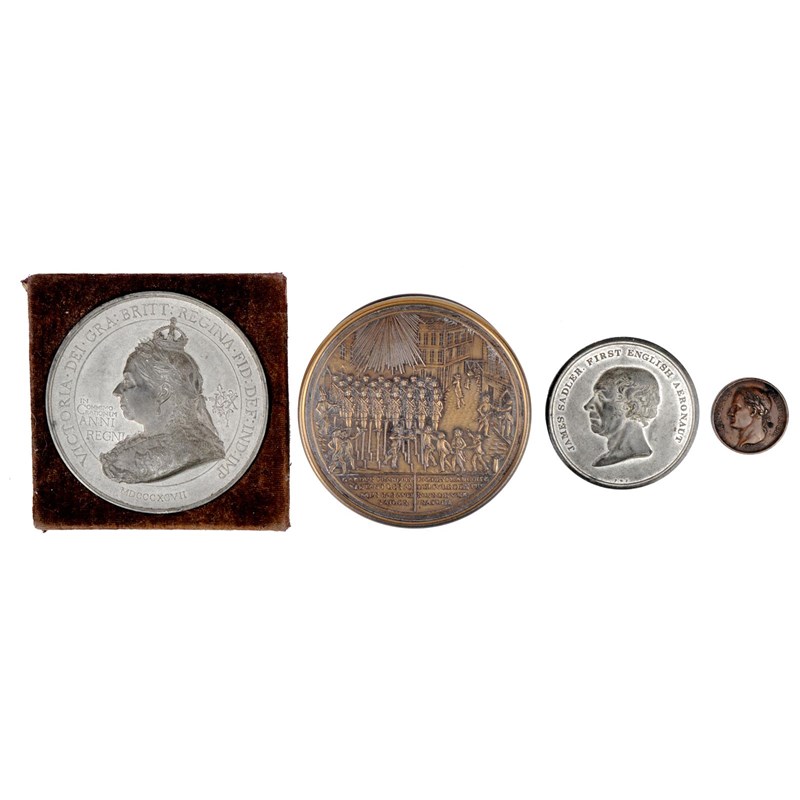 Commemorative Medals: James Sadler First English Aeronaut, 1811, reverse with ascending balloon basket, white metal 53mm (E 1020), good fine or better; Diamond Jubilee of Queen Victoria, 1897, reverse with Royal arms and fifty shields identifying British colonies and protectorates, white metal 76mm (E 1816); France, Napoleon Bonaparte, tomb of General Desaix, bronze 27mm, very fine; and a French Medal top box, with relief scene possibly after a woodcut, showing the French Guard surrendering at Versailles, 76mm. [4]