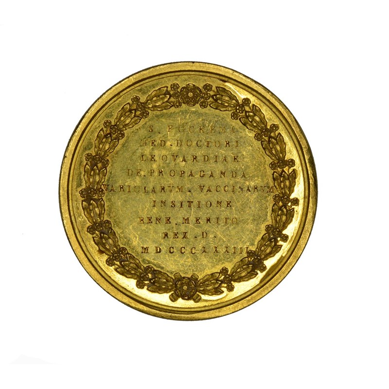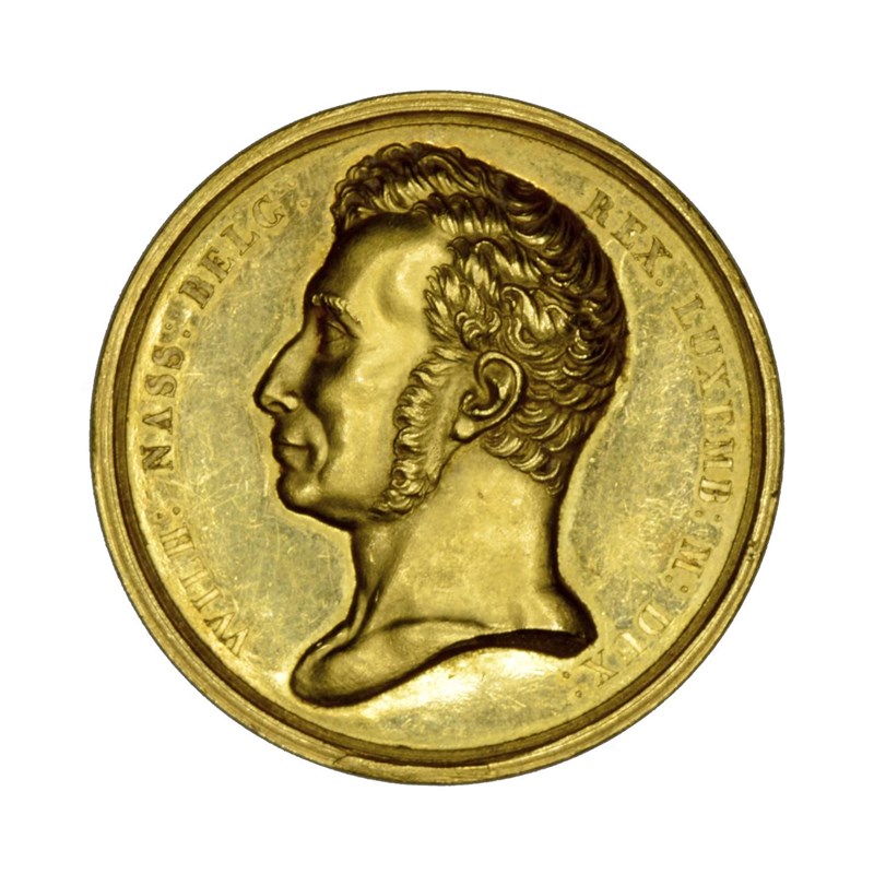 Netherlands: William I (1815-1840), a scarce gold medical reward medal, obverse with the King's bust sinister, legend: WILH: NASS: BELG: REX. LUXEMB: M: DUX:; reverse with impressed dedication within a wreath: S. FOCKEMA MED. DOCTORI LEOVARDIAE DE PROPAGANDA VARIOLARUM VACCINARUM INSITIONE BENE MERITO REX. D. MDCCCXXXIII, indicating that Dr Sybrandius Fockema of Leeuwarden was recognised in 1833 for administering inoculations against (or with) cowpox, 41mm, 28.7 grams.