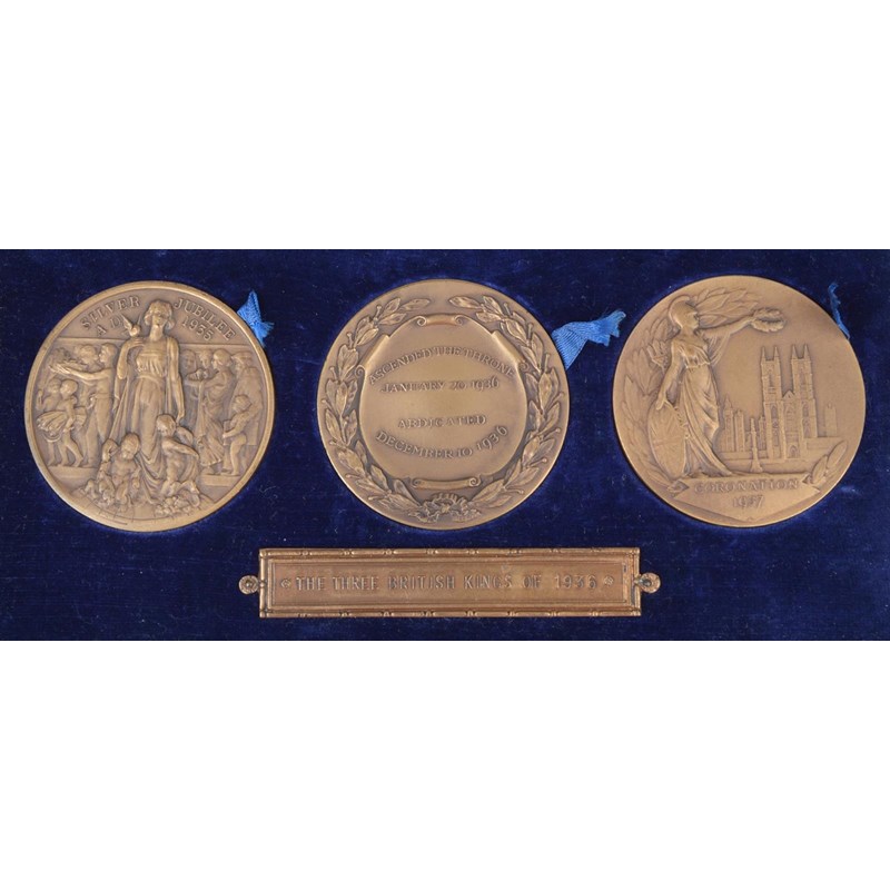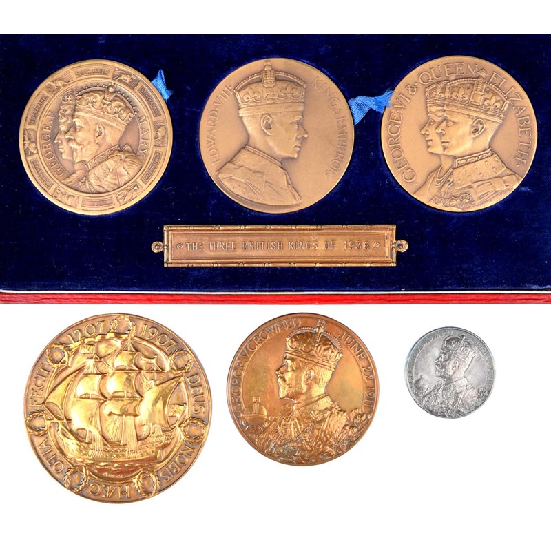 A small collection of medallions, comprising: Liverpool, 700th Anniversary of the Foundation, bronze, 64 mm; Coronation of George V 1911, reverse with bust of Queen Mary, bronze, 51mm; the same type in silver, 31mm; George V, Silver Jubilee 1935, conjoined busts surrounded by Commonwealth countries in panels, reverse with figure of the Mother Country with Commonwealth subjects, bronze, 51mm; Abdication of Edward VIII 1936, bronze, 51 mm; Coronation of George VI 1937; conjoined busts of George VI and Queen Elizabeth, bronze, 51mm (E 1898a; 1922a; 1922b; 2030; 2040a; 2047a). The first three good very fine or better, the last three cased together under the title 'THE THREE BRITISH KINGS OF 1936' and about as struck. [6]