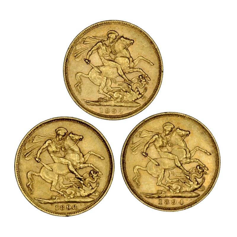 Victoria, gold sovereigns, veiled head: 1893, very fine; 1894, very fine or nearly so; 1898, fine (S 3874). [3]
