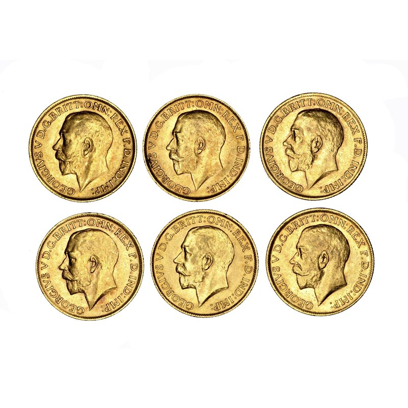 George V, gold sovereigns: 1911 (2), 1912 (4) (S 3996). Conditions vary from good fine to nearly extremely fine. [6]