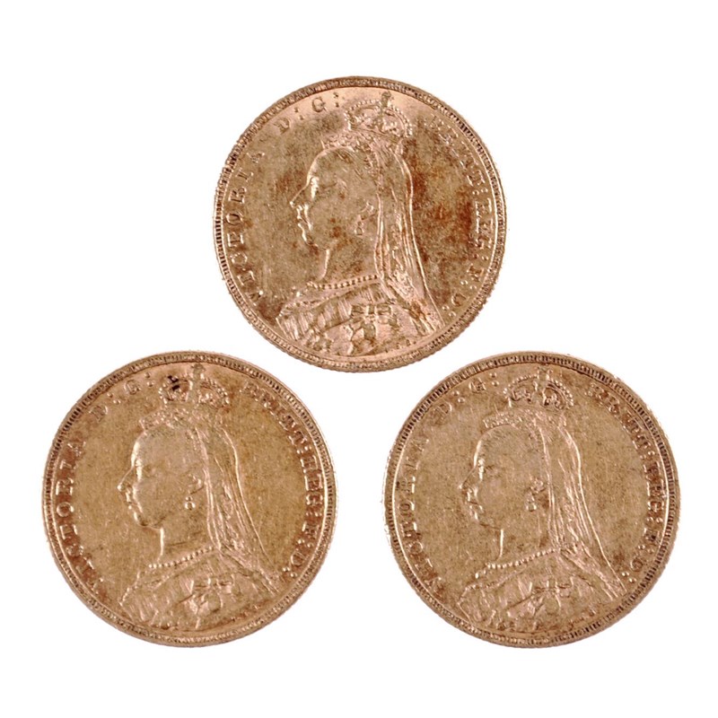 Victoria, gold sovereigns, Jubilee head: 1889 (S 3866B), very fine; 1888, Melbourne Mint; 1889, Melbourne Mint (S 3867B), both good fine. [3]