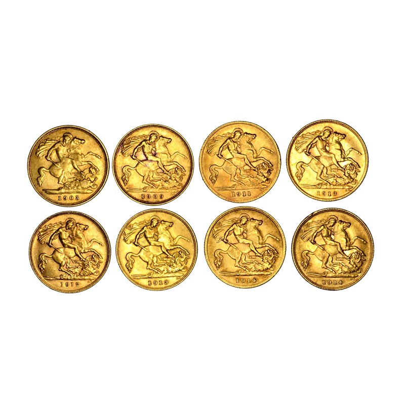 Gold half sovereigns (8): Edward VII: 1903, no BP in exuerge (S 3974A); 1909 (S 3974B); George V: 1911, 1912, 1913 (2), 1914 (2) (S 4006), the first two very fine, the remainder good very fine or better. [8]