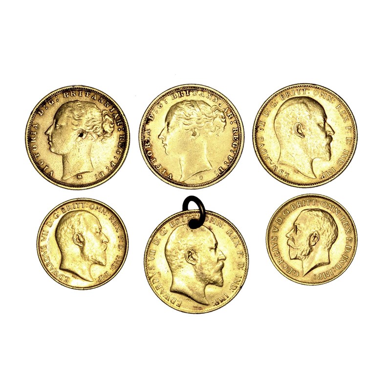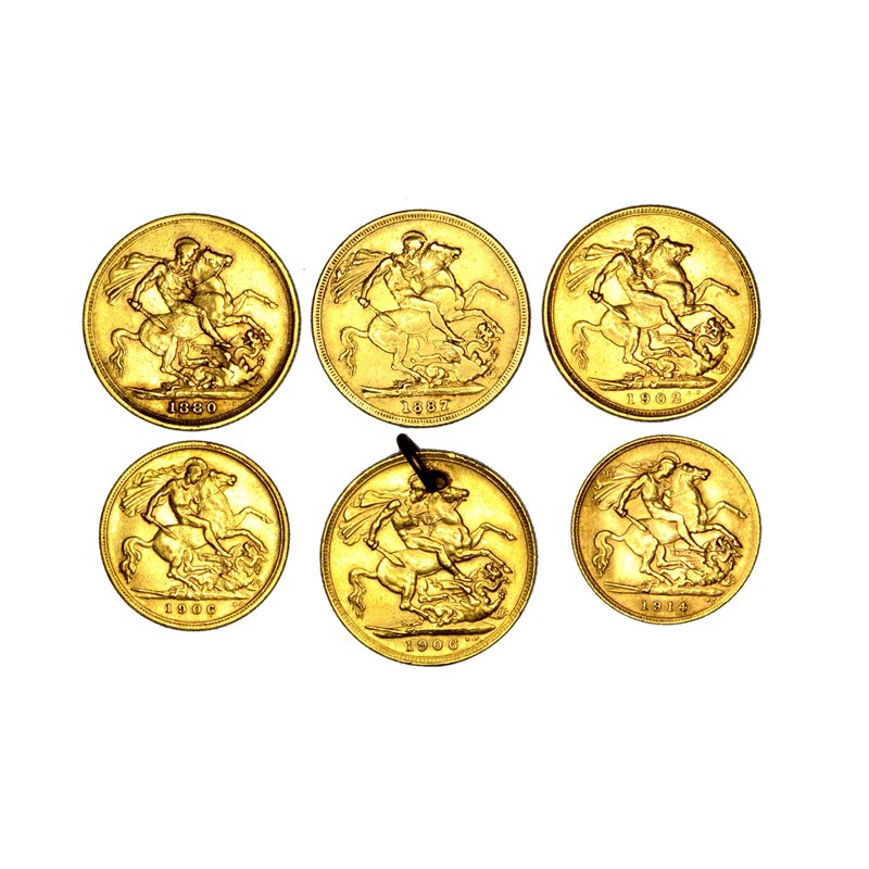 Victoria, gold sovereigns: 1880, Melbourne mint (S 3857), good fine; 1887, Sydney mint (S 3858E), good fine; Edward VII, sovereigns: 1902 (S 3969), very fine; 1906, Melbourne mint (S 3971) pierced for a ring, otherwise about very fine; Edward VII, half sovereign, 1906 (S 3974B), good fine; George V, half sovereign, 1914 (S 4006), good very fine. [6]
