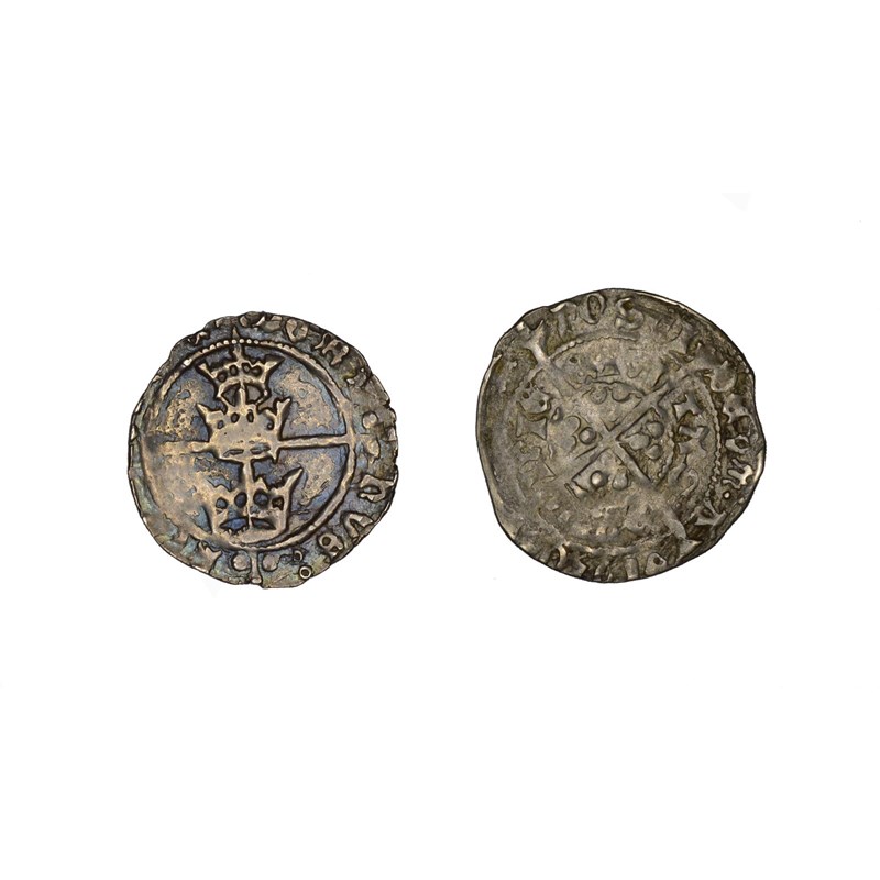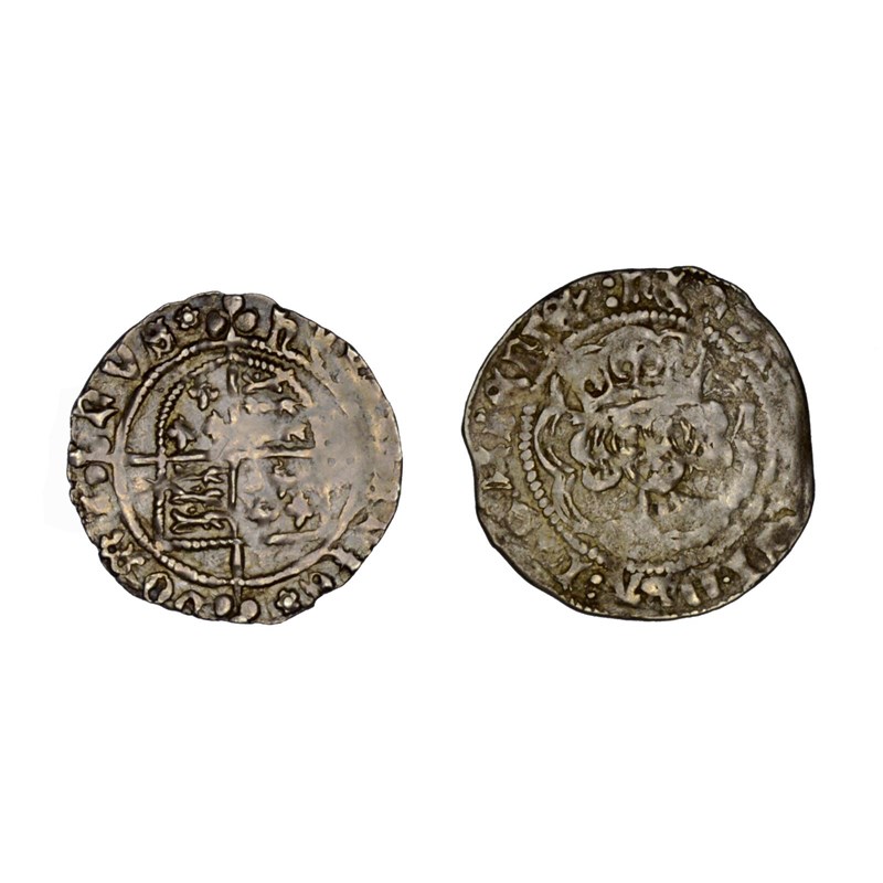 Ireland, Henry VII, two silver groats: early three crowns issue (1485-97), Dublin, r. DOMINUS HYBERNIE (S 6414), some clipping, fine; late portrait issue (c. 1496-1505), r. POSVI DEVM (S 6451), near fine. [2]
