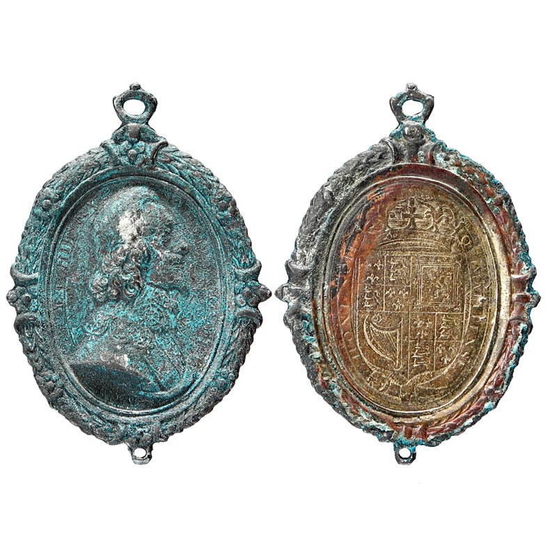 Charles I (1625-49), a Royalist Badge, copper-gilt oval 40 mm, bare headed bust right, rev. Royal Arms, raised wreath border with fixed suspension loop, little of plating left and much tarnished.