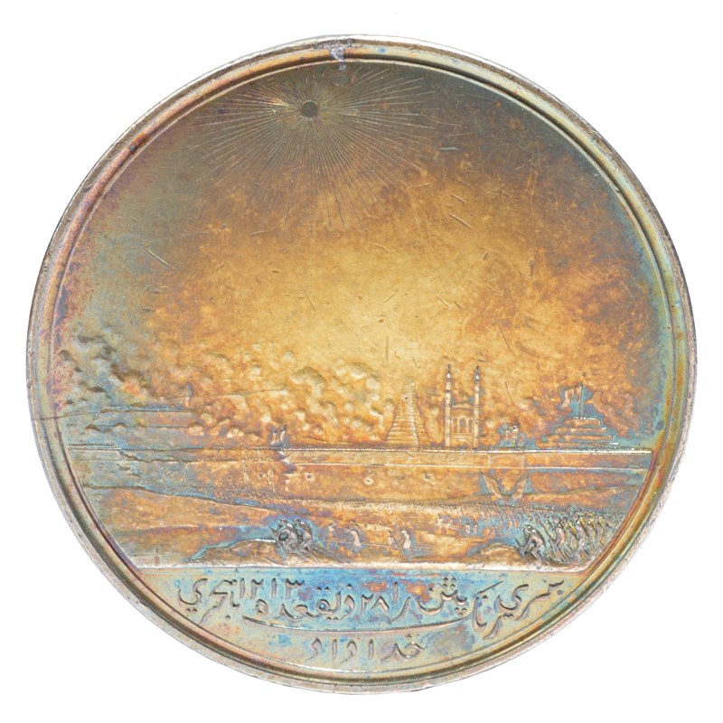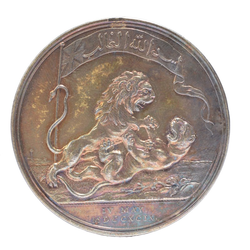 Honourable East India Company: Seringapatam Medal 1799, silver, 48mm, Soho Mint, evidence of a claw type suspension having been removed, claw marks and traces of solder at 12 o'clock, surface marks, otherwise better than good very fine, toned.