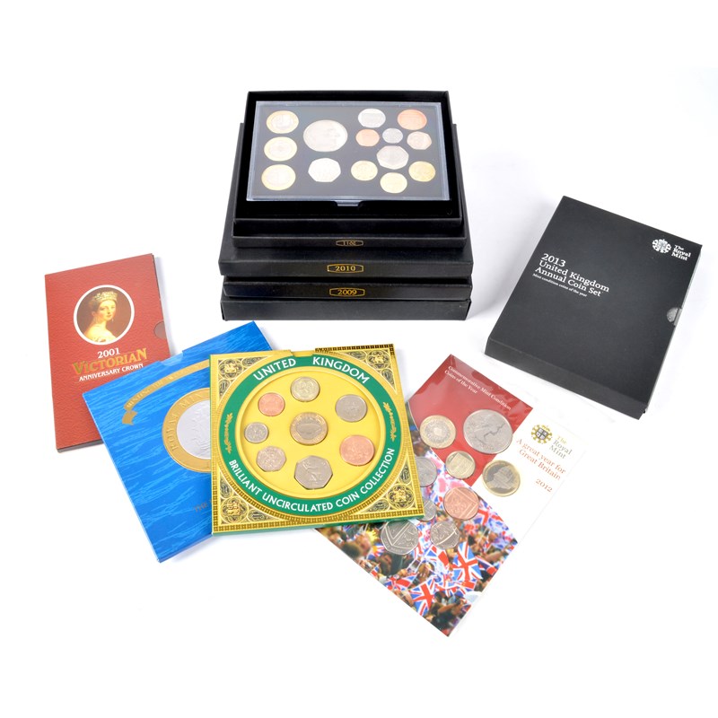 A collection of specimen proof set coins, including; Elizabeth II, 1999, Five Pounds, Diana, Princess of Wales memorial, (S 4551), specimen in presentation folder, as struck; Elizabeth II, 2002, Five Pounds, Golden Jubilee commemorative, (S 4555), specimen in presentation folder, as struck; Elizabeth II, 2003, Five Pounds, Coronation commemorative, (S 4557), specimen in presentation folder, as struck; Elizabeth II, 2008, 'Prince Charles 60th Birthday' £5 struck in c/n to 1 pence, (S PS96), Royal Mint cased as struck (7); Elizabeth II, 2009, 'Henry VIII' £5 struck in c/n to 1 pence, (S PS97), Royal Mint cased as struck (12); Elizabeth II, 2010, 'Restoration of the Monarchy' £5 struck in c/n to 1 pence, (S PS101), Royal Mint cased as struck (13); Elizabeth II, 2011, 'Prince Philip 90th Birthday' £5 struck in c/n to 1 pence, (S PS104), Royal Mint cased as struck (14); together with other Royal Mint cased and presentation folder sets, and a small quantity of other coins. [qty]