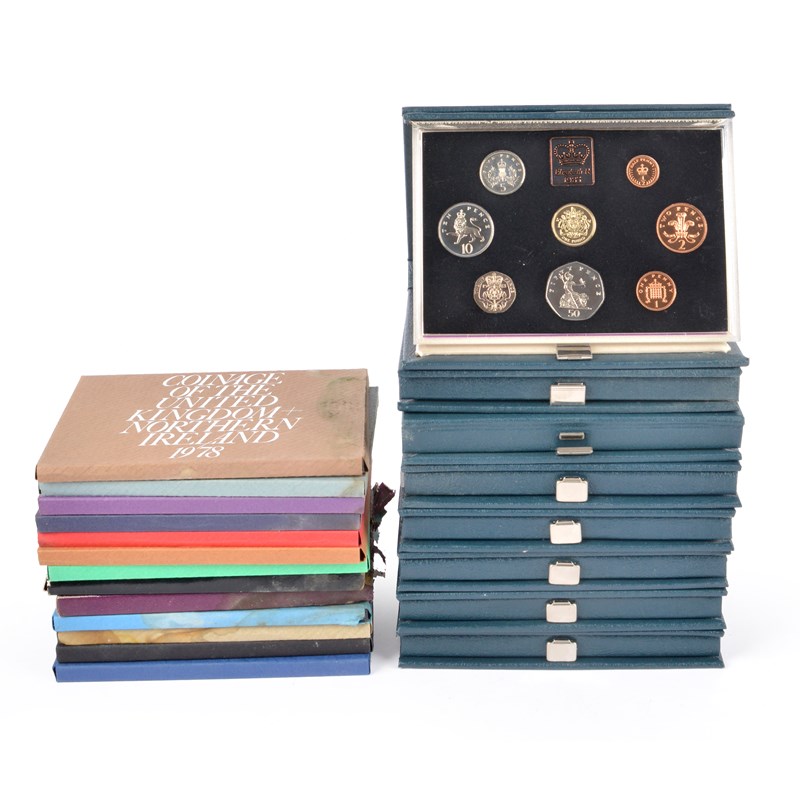 A collection of Royal Mint proof coin sets, including: Elizabeth II, 1983, 'UK' £1 to 1/2 pence, (S PS33), cased and as struck (8); Elizabeth II, 1984, 'Scottish' £1 to 1/2 pence, (S PS34), cased and as struck (8); Elizabeth II, 1985, 'Welsh' £1 to 1 pence, (S PS35), cased and as struck (7); Elizabeth II, 1986, 'Commonwealth Games' £2 to 1 pence, (S PS37), cased and as struck (8); Elizabeth II, 1987, 'English' £1 to 1 pence, (S PS39), cased and as struck (7); Elizabeth II, 1988, 'Arms' £1 to 1 pence, (S PS41), cased and as struck (7); Elizabeth II, 1989, 'Bill of Rights' and 'Claim of Right' £2s to 1 pence, (S PS43), cased and as struck (9); Elizabeth II, 1990, 'Welsh' £1 to 1 pence, (S PS45), cased and as struck (8); together with several Royal Mint cased proof sets. [qty]