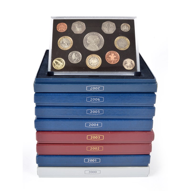 A collection of Royal Mint proof set coins, including; Elizabeth II, 2000, 'Millennium' £5 struck in c/n to 1 pence, (S PS65), cased and as struck (10); Elizabeth II, 2001, 'Victoria' £5 to 1 pence, (S PS68), cased and as struck (10); Elizabeth II, 2002, 'Golden Jubilee' £5 to 1 pence, (S PS72), cased and as struck (9); Elizabeth II, 2003, 'Coronation' £5 to 1 pence, (S PS78), cased and as struck (11); Elizabeth II, 2004, 'Penydarren engine' £2 to 1 pence, (S PS81), cased and as struck (10); together with other Royal Mint proof sets. [qty]