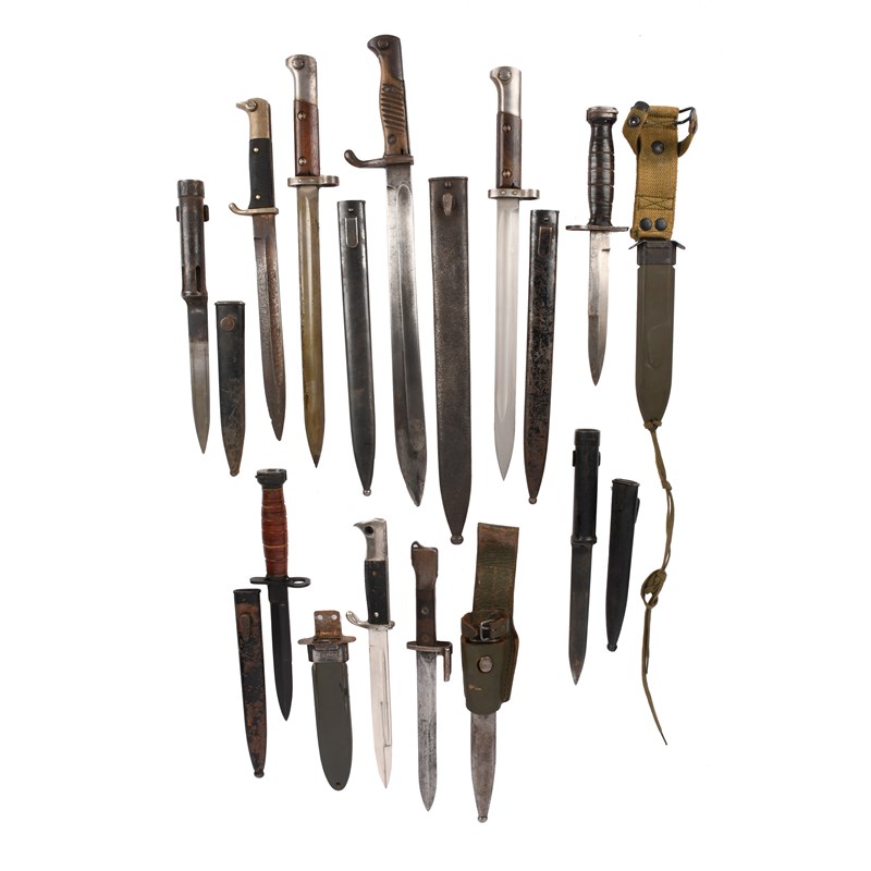 A collection of various bayonets, comprising: a German model 98/05, broad blade and steel scabbard, by Düfkopp; two Czech VZ 24 bayonet, with steel scabbards; two German k98 parade bayonets, one with scabbard; a Belgian FAL type A, steel scabbard and leather frog; two Belgian FAL type C, synthetic scabbards; and two American M4 type bayonets in scabbards (one of recent German manufacture). [10]