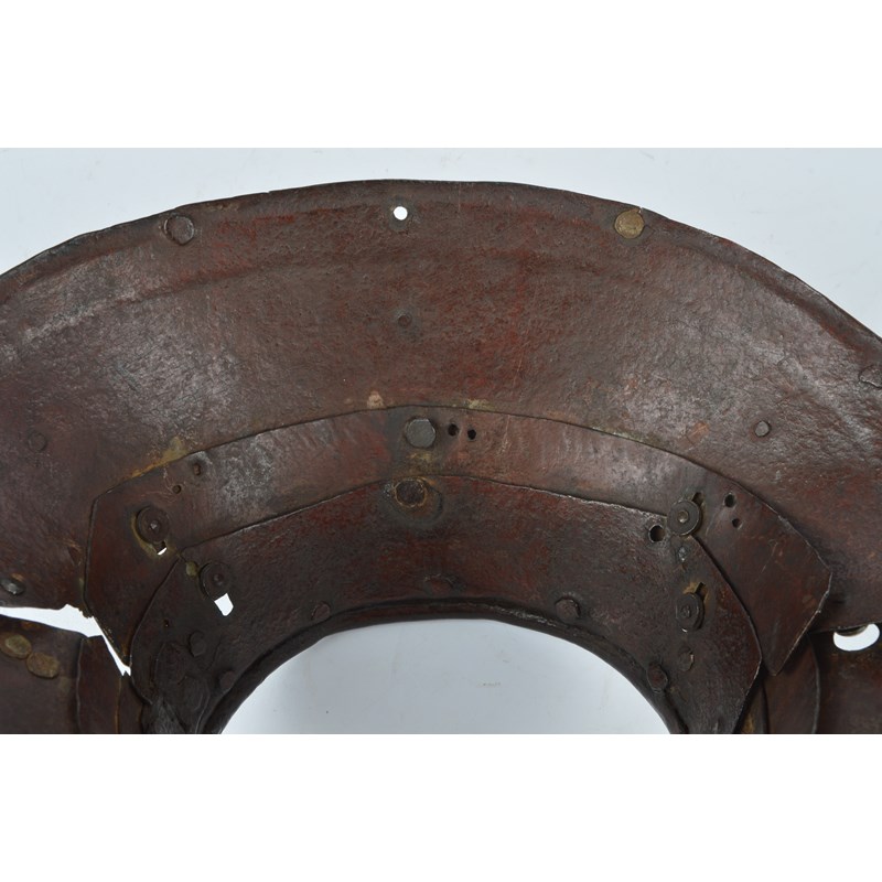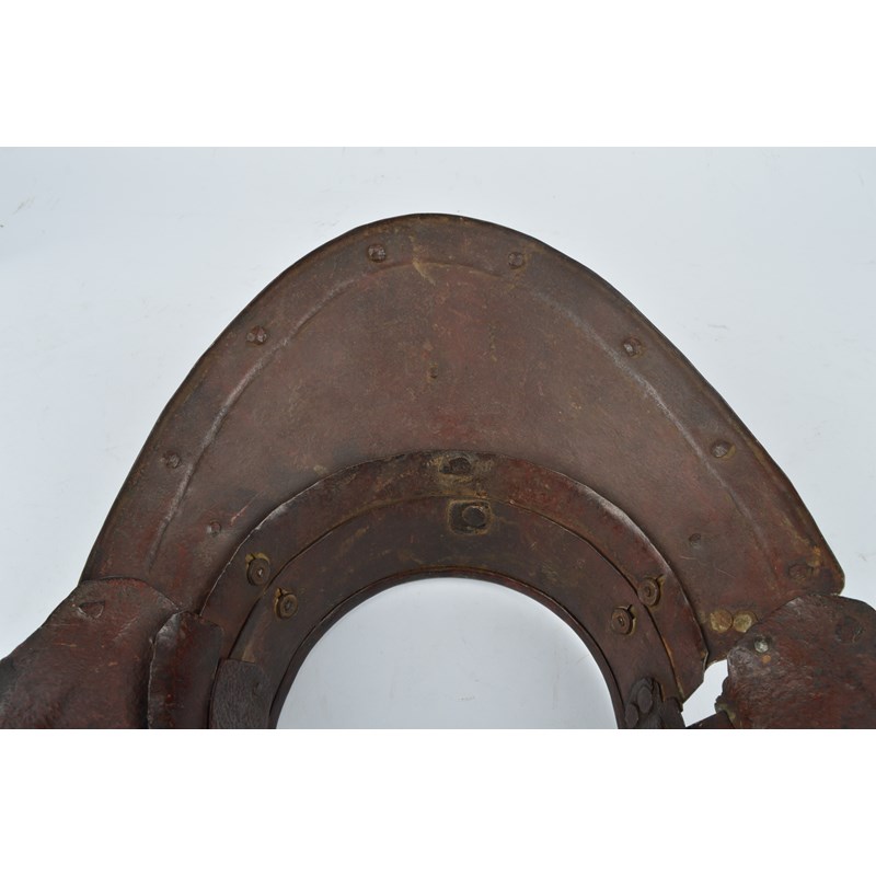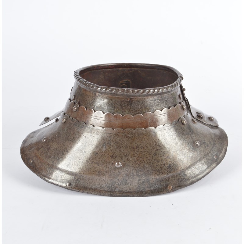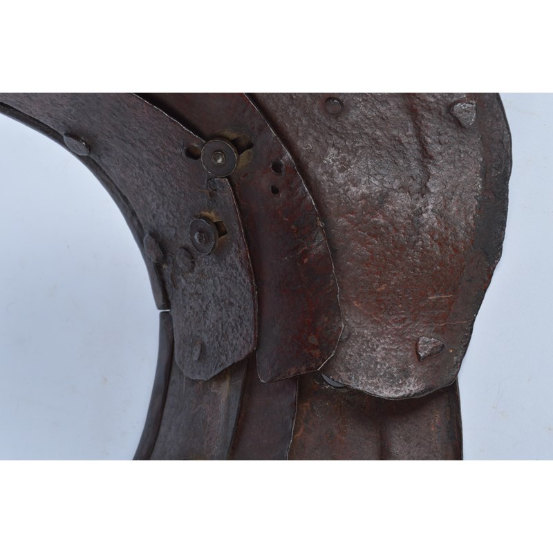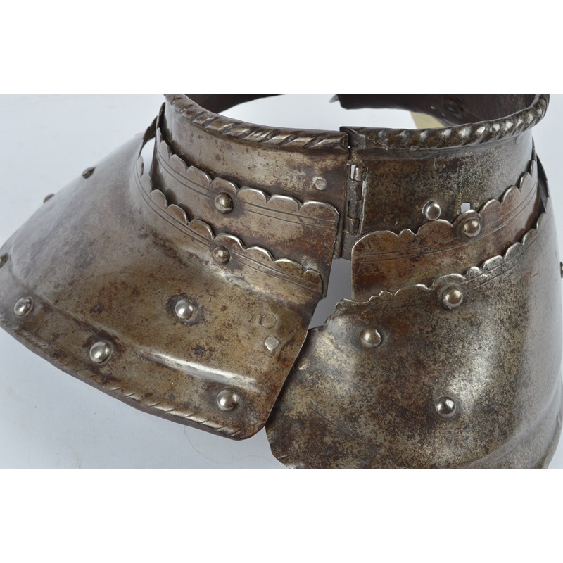 A gorget, composed of large shaped plates front and rear with recessed borders, roped lower and scalloped upper edges; the neck covered by two circular lames, the lower with scalloped edge and the upper roped; flexibility accomplished by rivets riding in vertical slots, the whole assembly hinged at the left of the upper lame, and secured at the right by a post and hole to the upper lame, and a stud locking into a shaped hole on the lower plates; in the manner of the late 16th century and thought to be of the period.