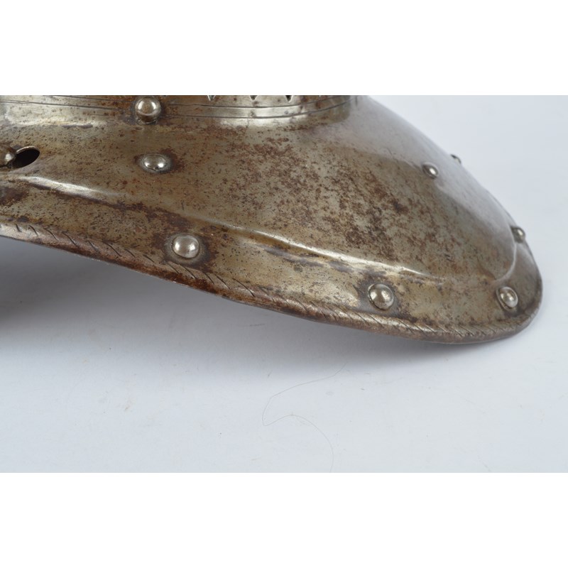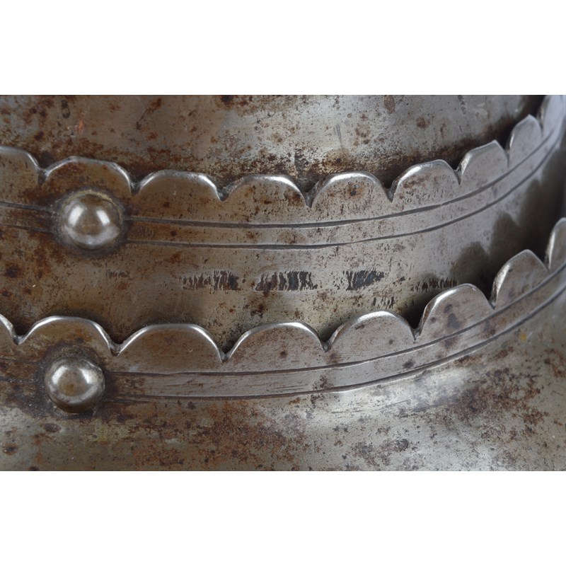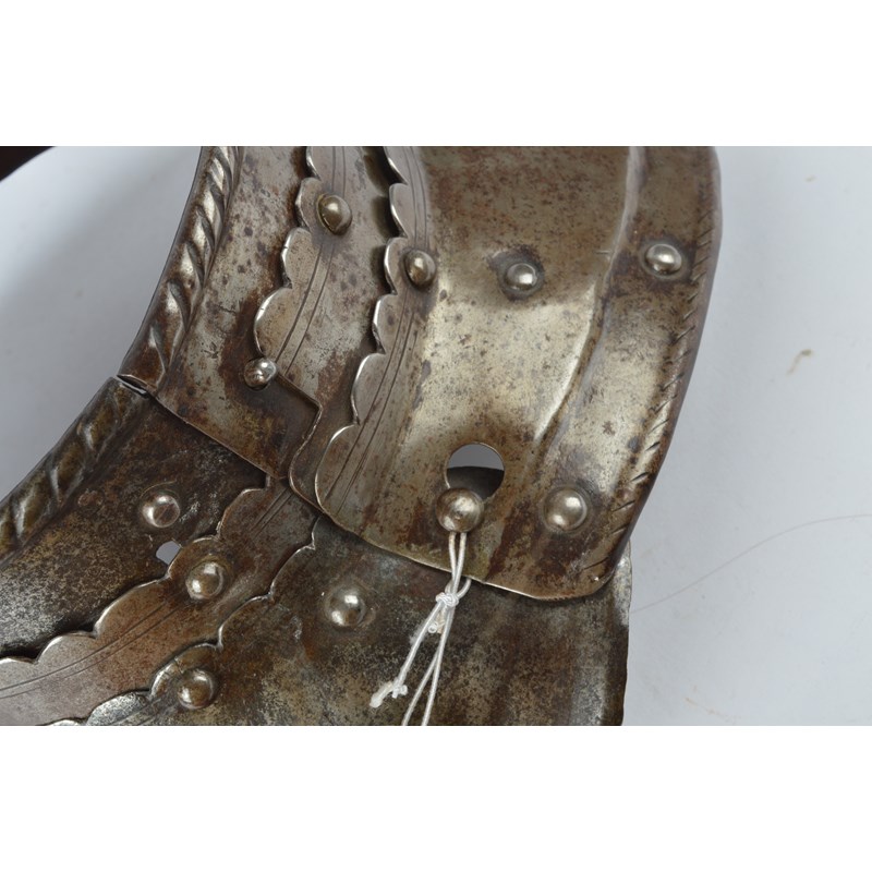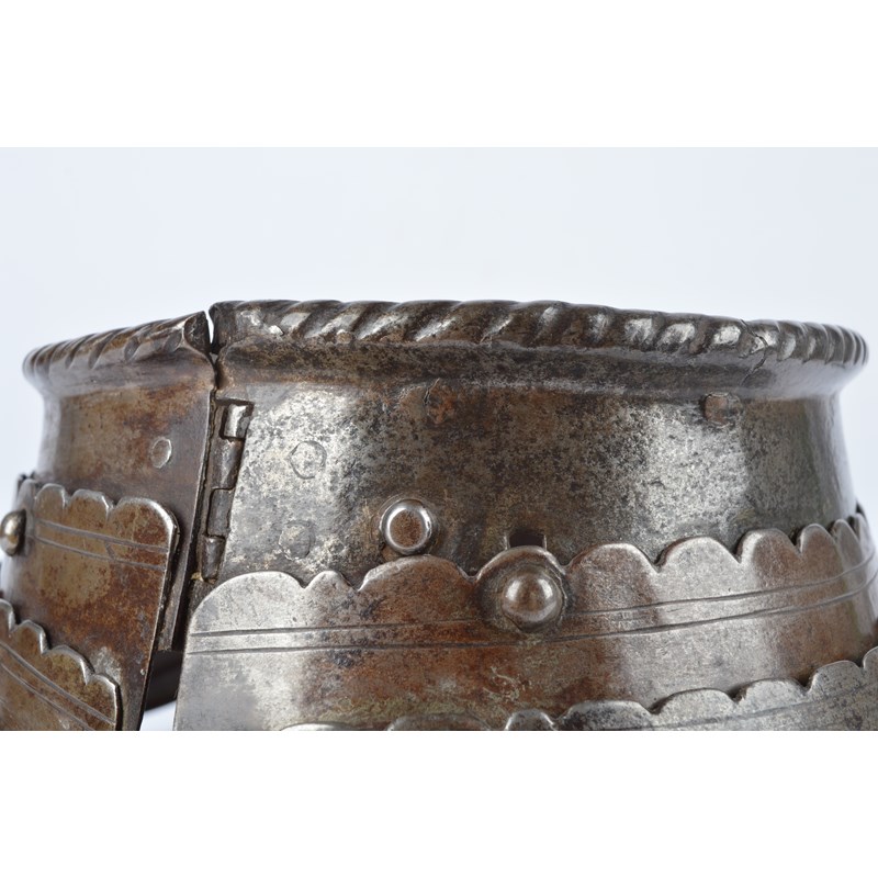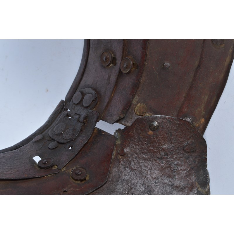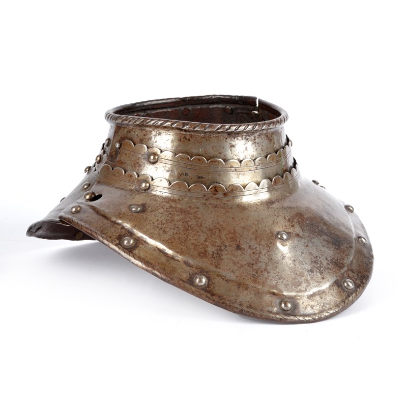 A gorget, composed of large shaped plates front and rear with recessed borders, roped lower and scalloped upper edges; the neck covered by two circular lames, the lower with scalloped edge and the upper roped; flexibility accomplished by rivets riding in vertical slots, the whole assembly hinged at the left of the upper lame, and secured at the right by a post and hole to the upper lame, and a stud locking into a shaped hole on the lower plates; in the manner of the late 16th century and thought to be of the period.