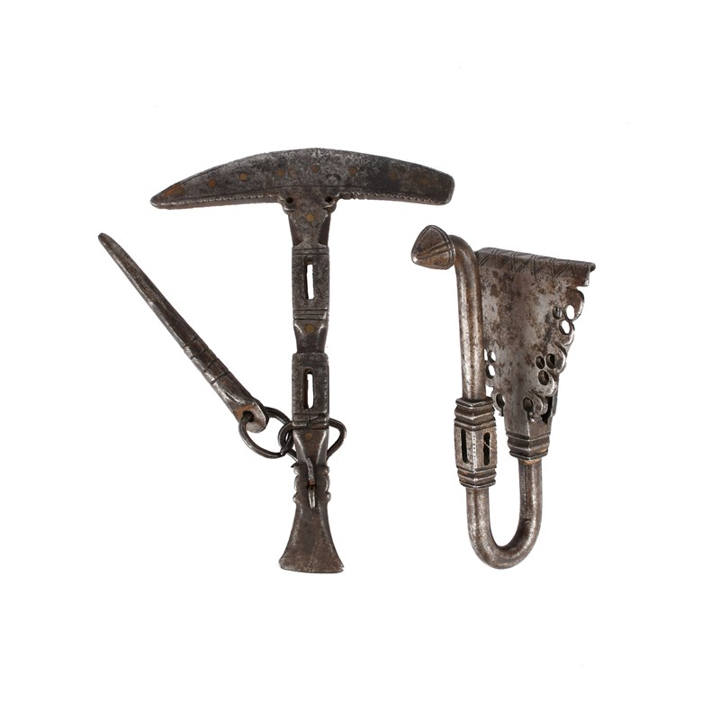 An iron sword belt hook, of cossack type, triangular belt plate with scalloped border and pierced decoration, long upright hook with bud terminal and interrupted by a slotted square-section detail; together with a flint knapping hammer of similar style, slim crescent-shaped head, two-stage handle pierced with slots and flared chisel-like terminal, linked by two loose rings to an iron spike; Turkish or West/Central Asian. [2]
