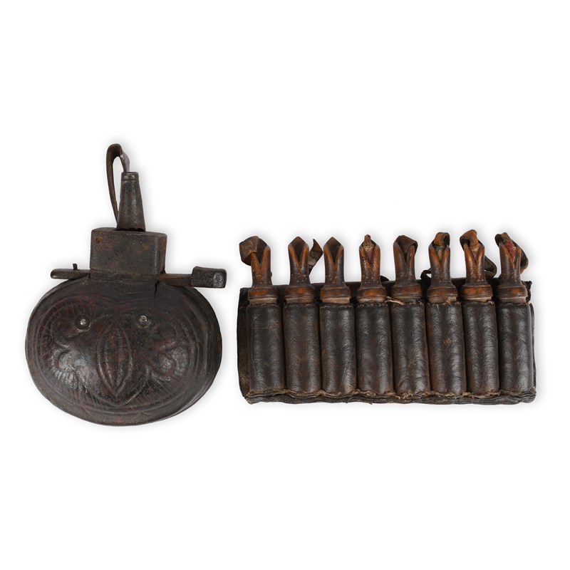 A set of eight Turkish gunpowder cartridges, wooden, with turned tops and elegantly tapering spouts, fabric stoppers retained by leather straps, in a leather pouch with eight fitted compartments; together with a pomegranate shaped powder flask, embossed leather over wood, iron spout with sliding wooden shutter, associated iron belt loop. [2]