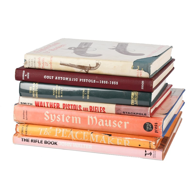 A quantity of firearms related reference books, including: John Walter. 'The Rifle Book'; Breathed and Schroeder, 'System Mauser, a Pictorial History of the Model 1896 Self-Loading Pistol'; John Nigel George, 'English Pistols and Revolvers'; and other titles. [7]