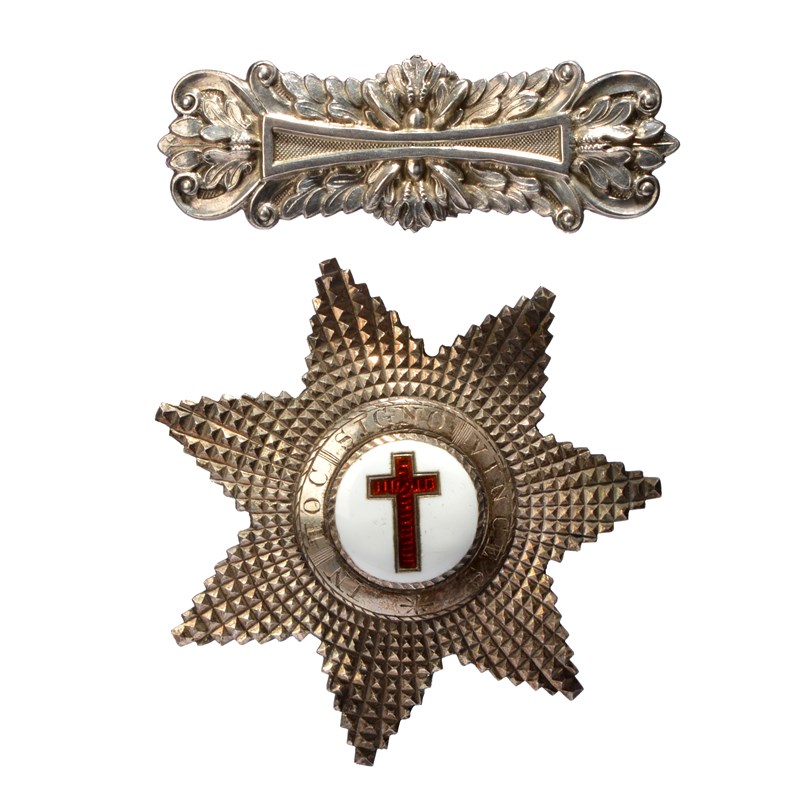 A Victorian silver military dress belt slide, of rectangular form modified by scrolls and acanthus leaves, T. B. Wilkins Ltd., Birmingham 1869; together with a masonic 'Knights Templar' silver breast badge, seven pointed star with central device of a red cross to a white ground, border engraved 'IN HOC SIGNO VINCES', Birmingham 1871. [2]