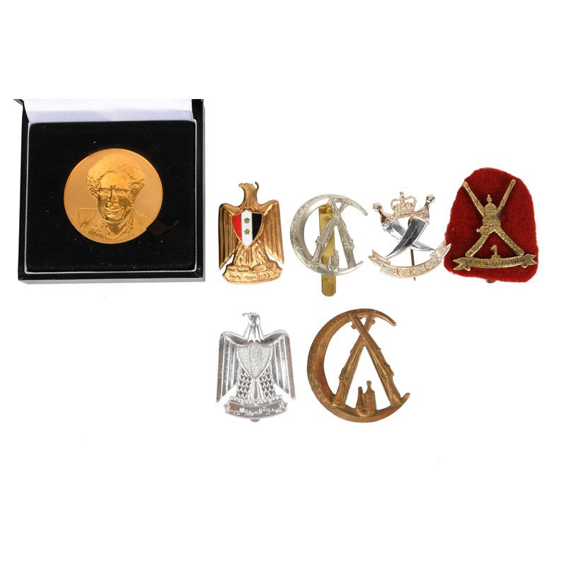 A collection of international insignia, mainly MIddle Eastern, including cap badges, rank insignia, and other items; representing: The Libyan Arab Republic, The Republic of Sudan, The Federation of South Arabia, The Syrian Arab Republic, The Republic of South Africa, and other nations. [qty]