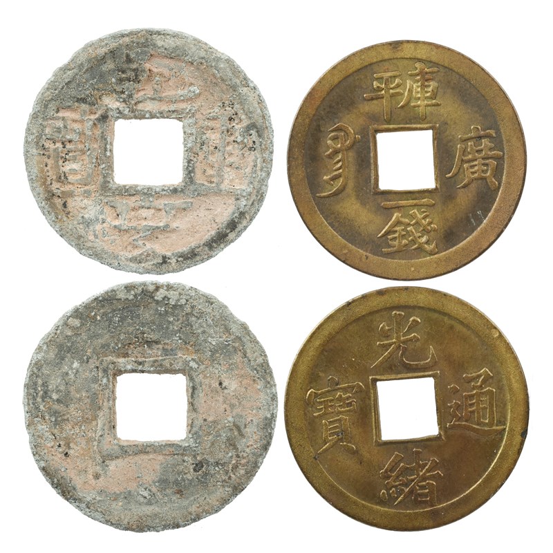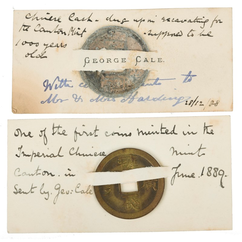 The first coin is described as having been found during the excavation of the Canton Mint in 1888, the second as one of the first coins struck in the new mint, June 1899; each making reference to a George Cale.