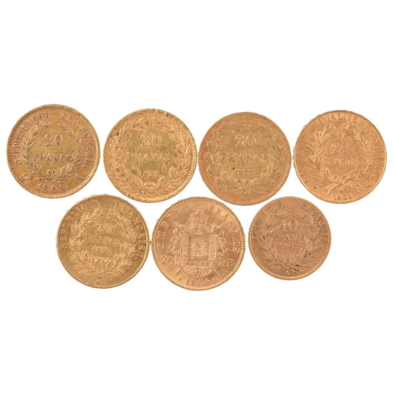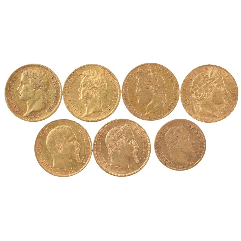 France: a small collection of gold coins (7), comprising: Empire: Napoleon, twenty francs, 1808 A (KM687.1), very fine; Second Kingdom: Louis Philippe I, twenty francs (2), 1831 A, 1837 A (KM 739.1, 750.1), very fine and fine; Second Republic: twenty francs, 1851 A (KM 762), very fine or a little better; Second Empire: twenty francs, 1852 A (KM 774), good very fine; twenty francs, 1864 A (KM 801.1), nearly extremely fine; ten francs, 1863 A (KM 800.1), good fine. [7]