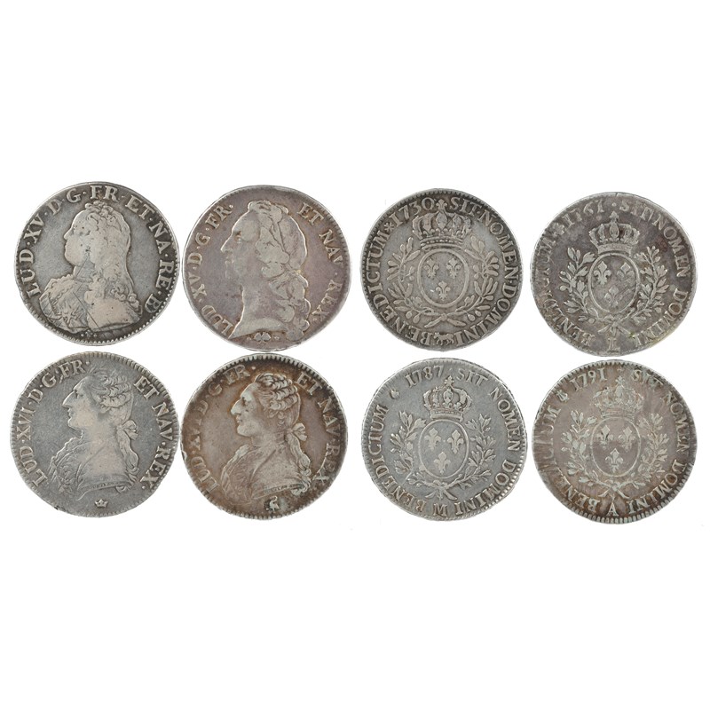 France - Kingdom: four silver ecus: Louis XV, 1730, mm cow, issued for Priovince of Bearn (KM 487), near fine; 1761 L (KM 512.12), at least fine; Louis XVI, 1787 M (KM 564.10), about very fine; 1791 A (KM 564.1), good fine. [4]
