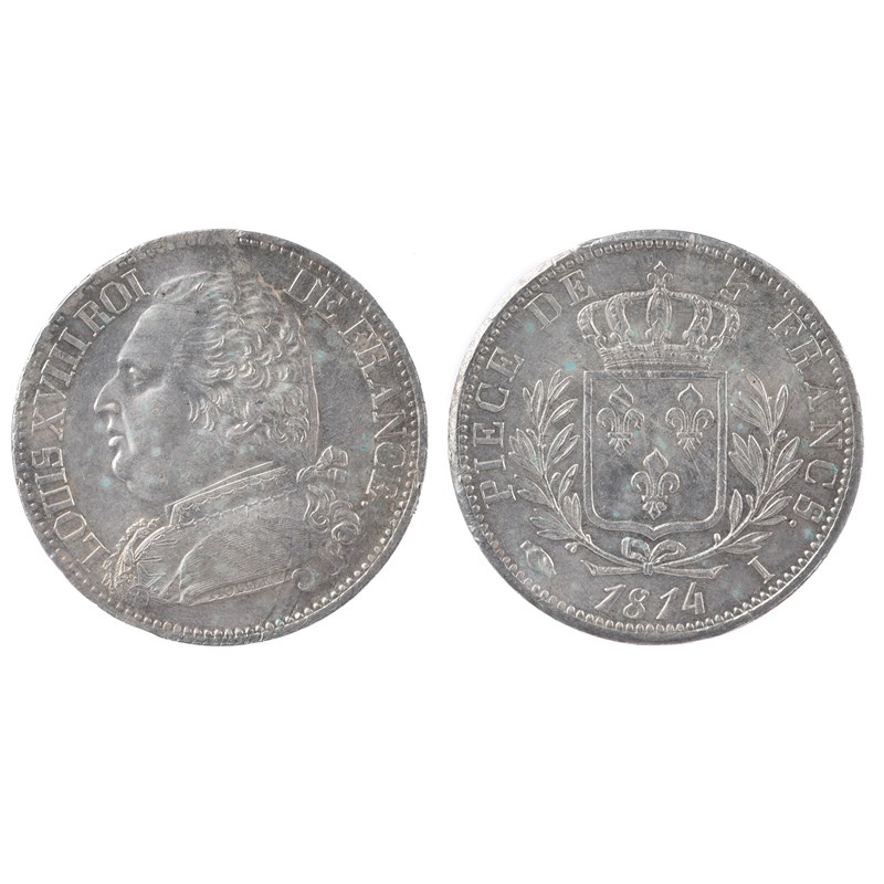 France - First Restoration: Louis XVIII, silver five francs, 1814 I, Limoges (KM 702.6), nearly extremely fine.