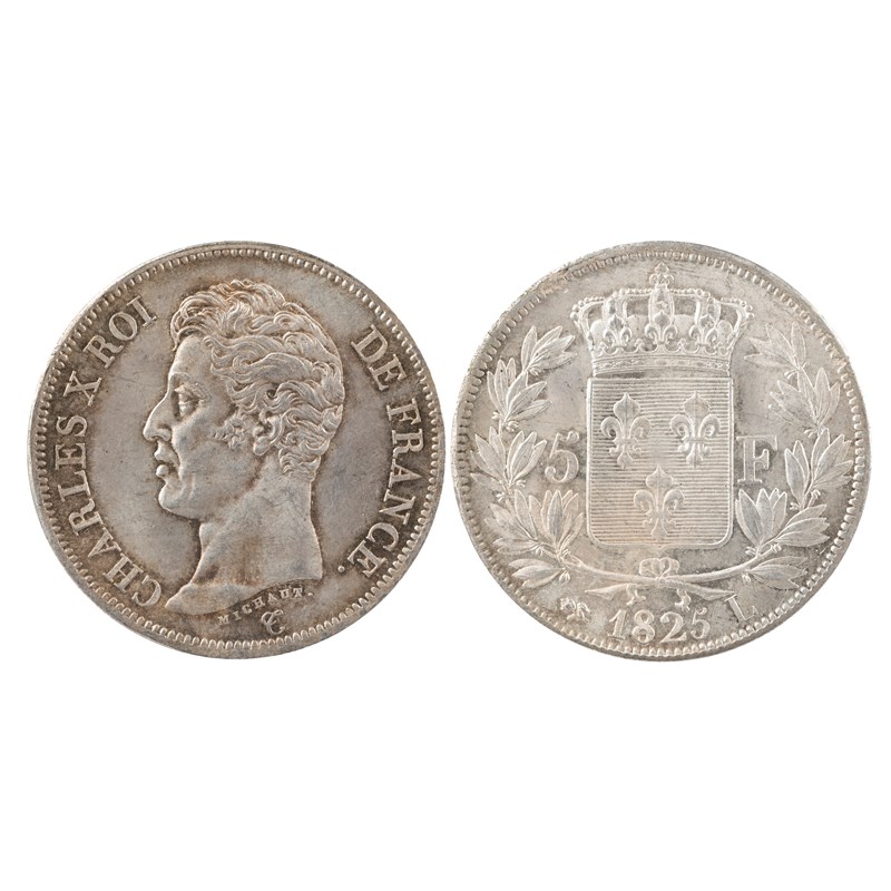 France - Second Kingdom: Charles X, silver five francs, 1825 L, Bayonne (KM 720.8), better than extremely fine.