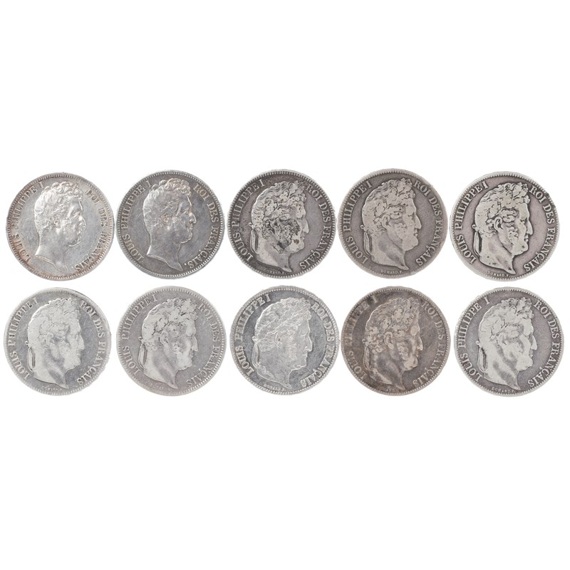 France - Second Kingdom: Louis Philippe, silver five francs (10), 1831 A, 1831 D, 1834 W, 1836 BB, 1837 B, 1838 B, 1841 W, 1843 W (this extremely fine), 1845 W, 1846 BB, from fine to very fine except where otherwise indicated. [10]