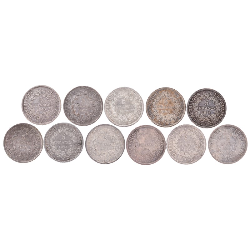 France - Second Republic: silver five francs, Hercules group, 1848 A, 1849 A (KM 756.1), near very fine; Third Republic: five francs (9), 1873 A (3), 1874 A, 1875 A, 1876 A (2) (KM 820.1), mainly extremely fine or nearly so; 1873 K, 1874 K (KM 820.2), very fine and better. [11]